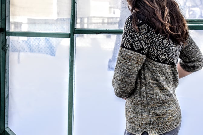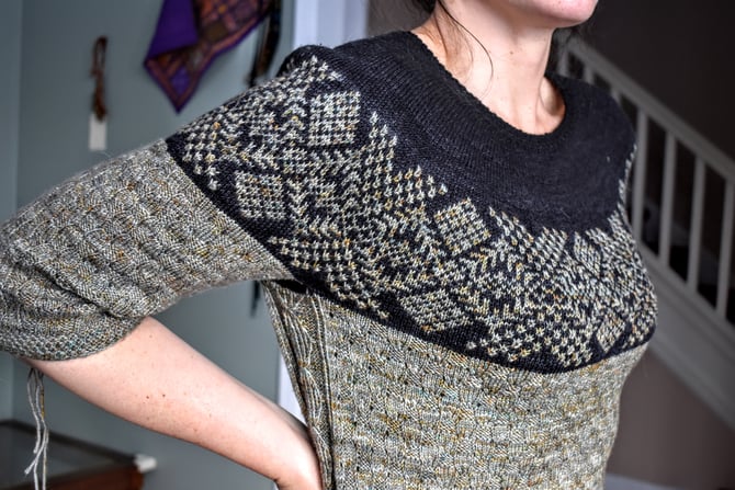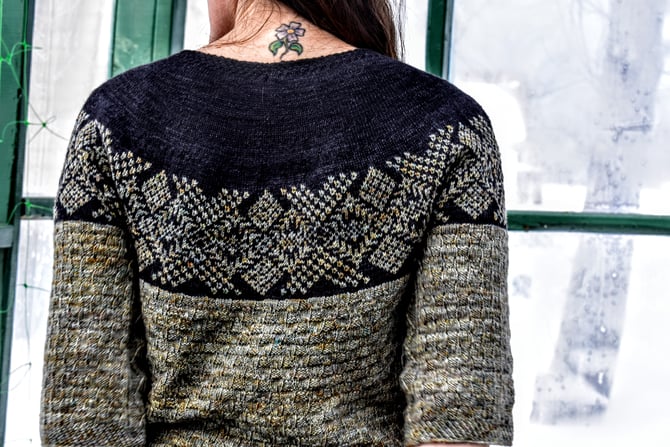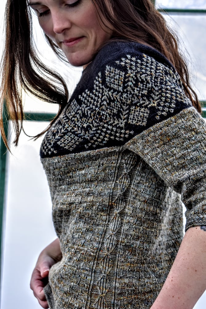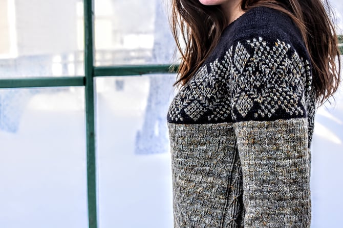 Saint Lunaire-Griquet is a bottom-up, textured, colourwork circular yoke. The textured stitch embedded in the colourwork yoke is meant to accentuate a speckled yarn against a high contrast background. Stars in the night sky. Like building blocks, the body and sleeves are round after round of an eyelet basketweave stitch bordered by a twisted stitch diamond cable along the sides.