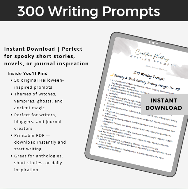 Jumpstart your creativity with 300 original writing prompts designed for every genre — from dark fantasy to romance, sci-fi, horror, and poetry.