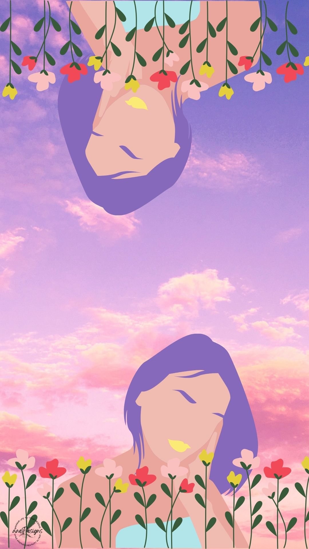 Mirror image of a young woman sitting next a row of flowers theme cellphone wallpaper for andriod & ios.