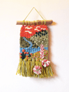 And you'll accomplish this landscape by weaving the background first (hills, lake, sky), and then embroidering all the details (flowers, trees, water stream, clouds, etc.), by the end, the result is a simple, fun and adorable landscape tapestry to hang on your wall.