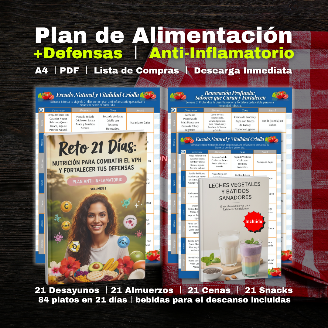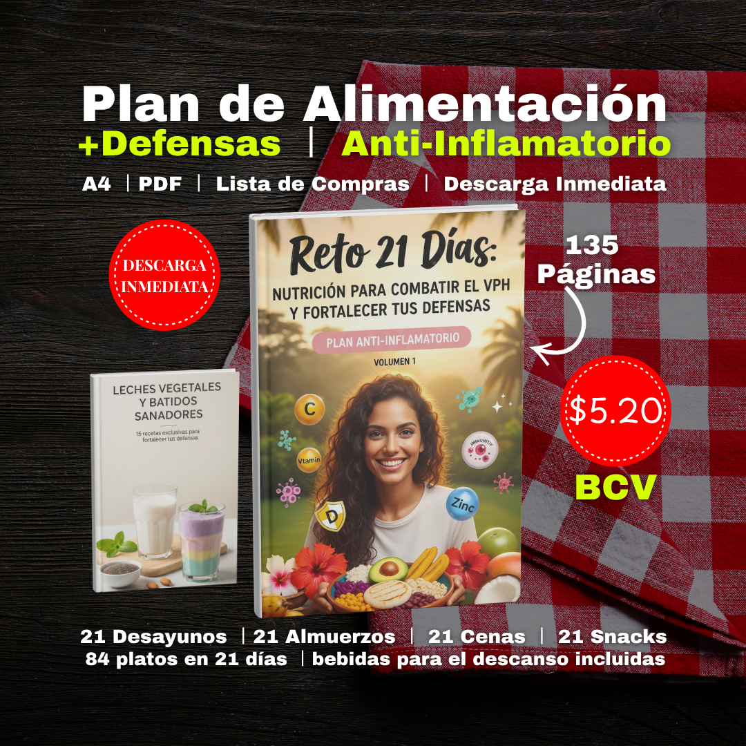 Te presento el "Reto 21 Días: Nutrición para Combatir el VPH y Fortalecer tus Defensas. Plan de Alimentación Antiinflamatorio (Volumen 1)". Este no es solo un plan de alimentación, es una guía completa y accesible diseñada para empoderarte a través de la comida.