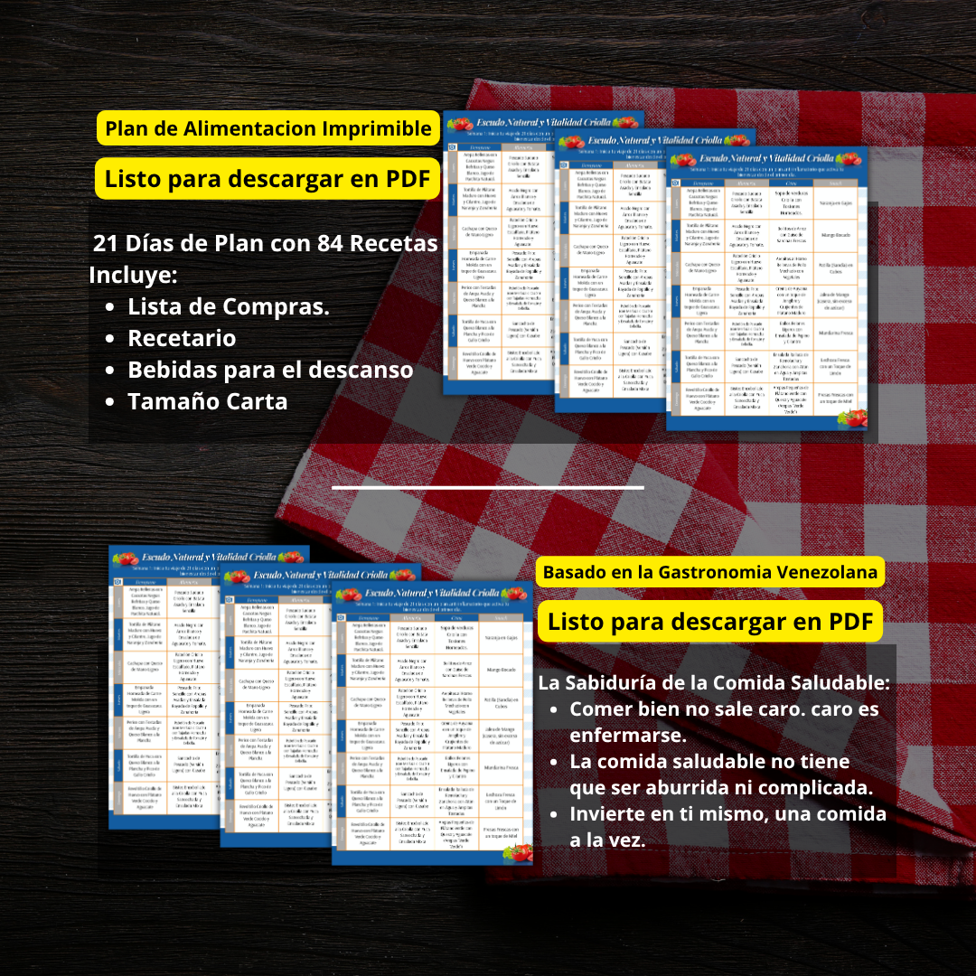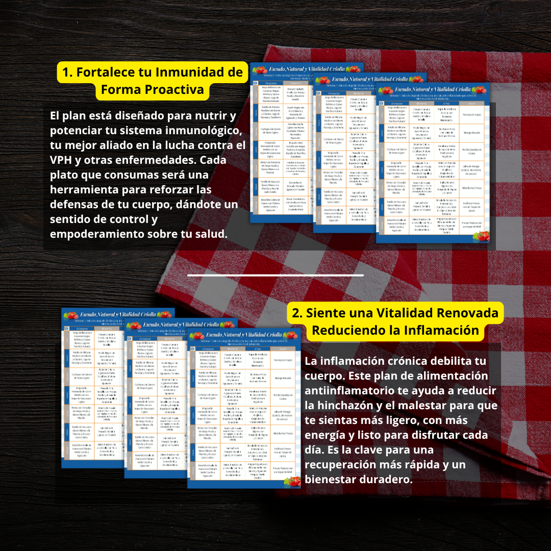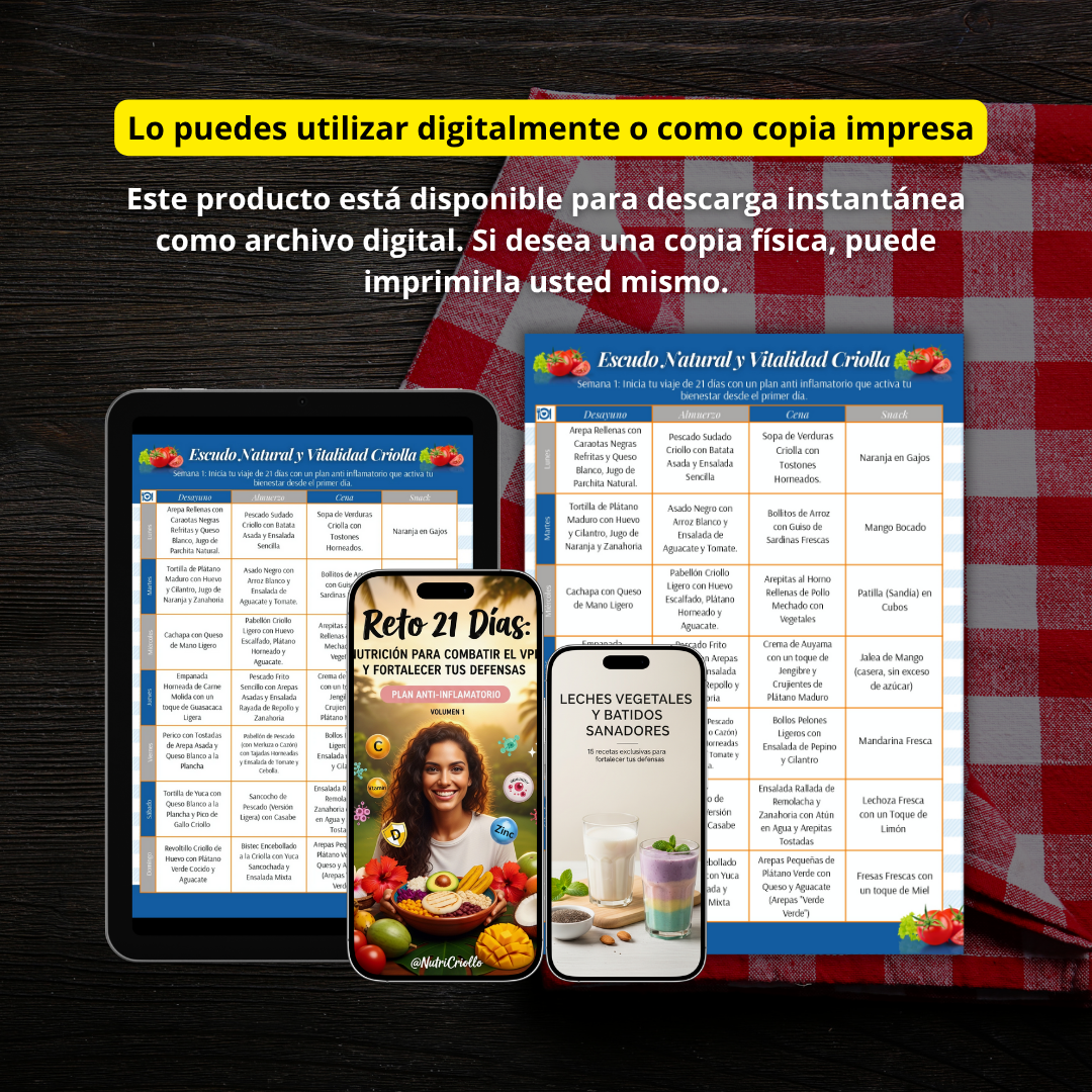 - Recetas inspiradas en Venezuela: Disfruta de sabores que te encantan, adaptados para ser antiinflamatorios y ricos en nutrientes que apoyan tu sistema inmunológico.