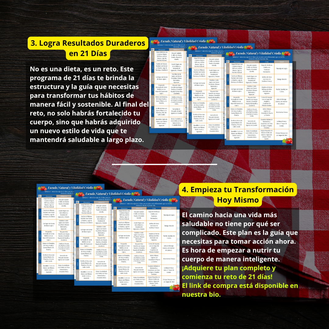 - Plan de Alimentación de 21 Días: Recetas sencillas, deliciosas y fáciles de preparar. No necesitarás ingredientes extraños ni pasar horas en la cocina.