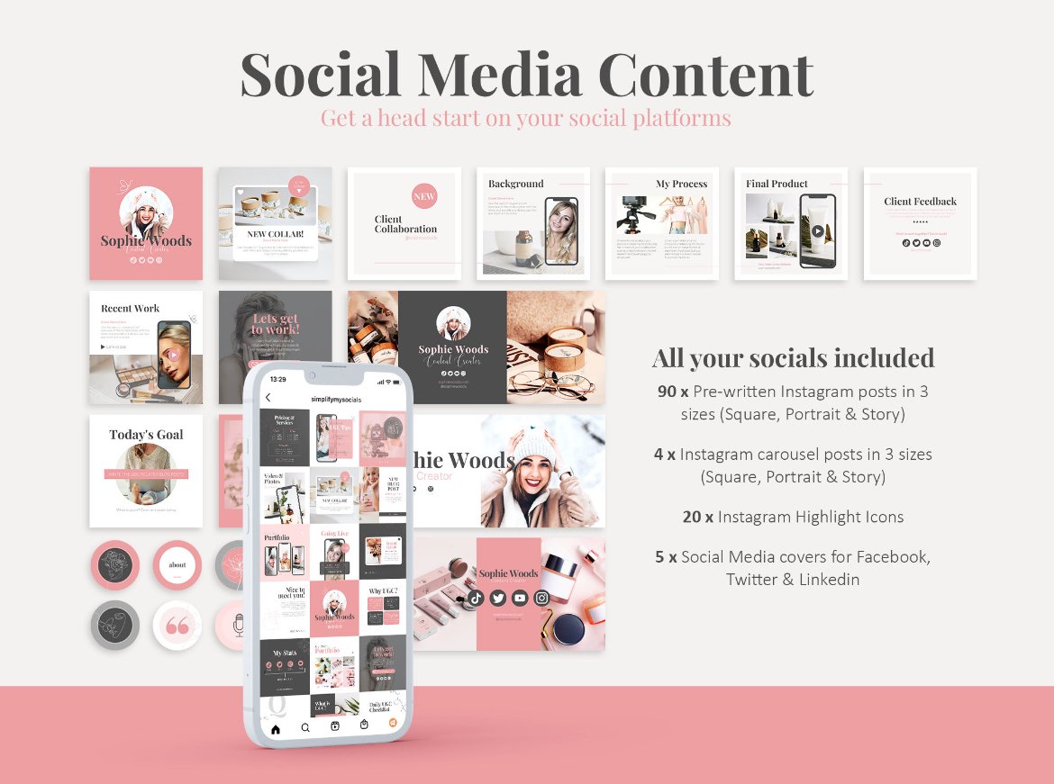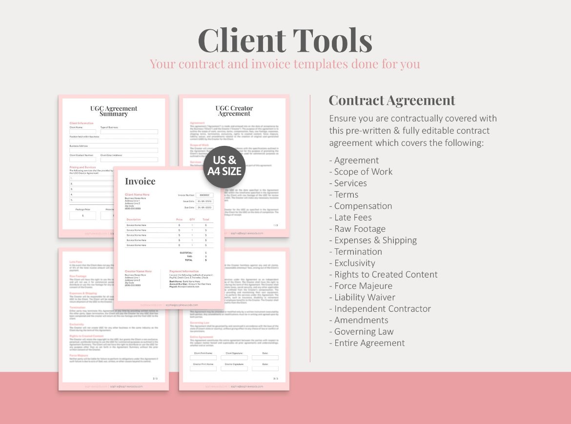 contains portfolio template , influencer contract template, media kit, social media trackers, intagram content prompts