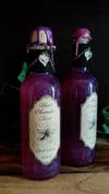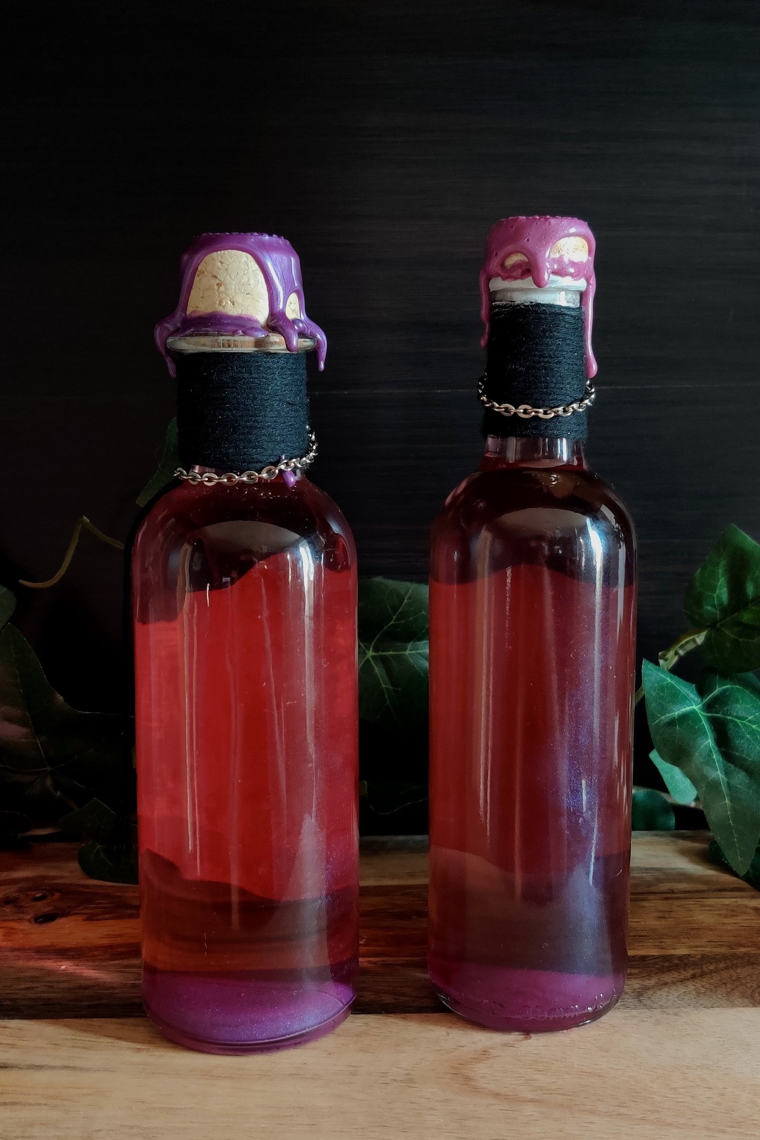 Pullossa on tummanpunaista nestettä ja se on koristeltu käsintehdyllä etiketillä, narulla sekä ketjulla ja riipuksella.