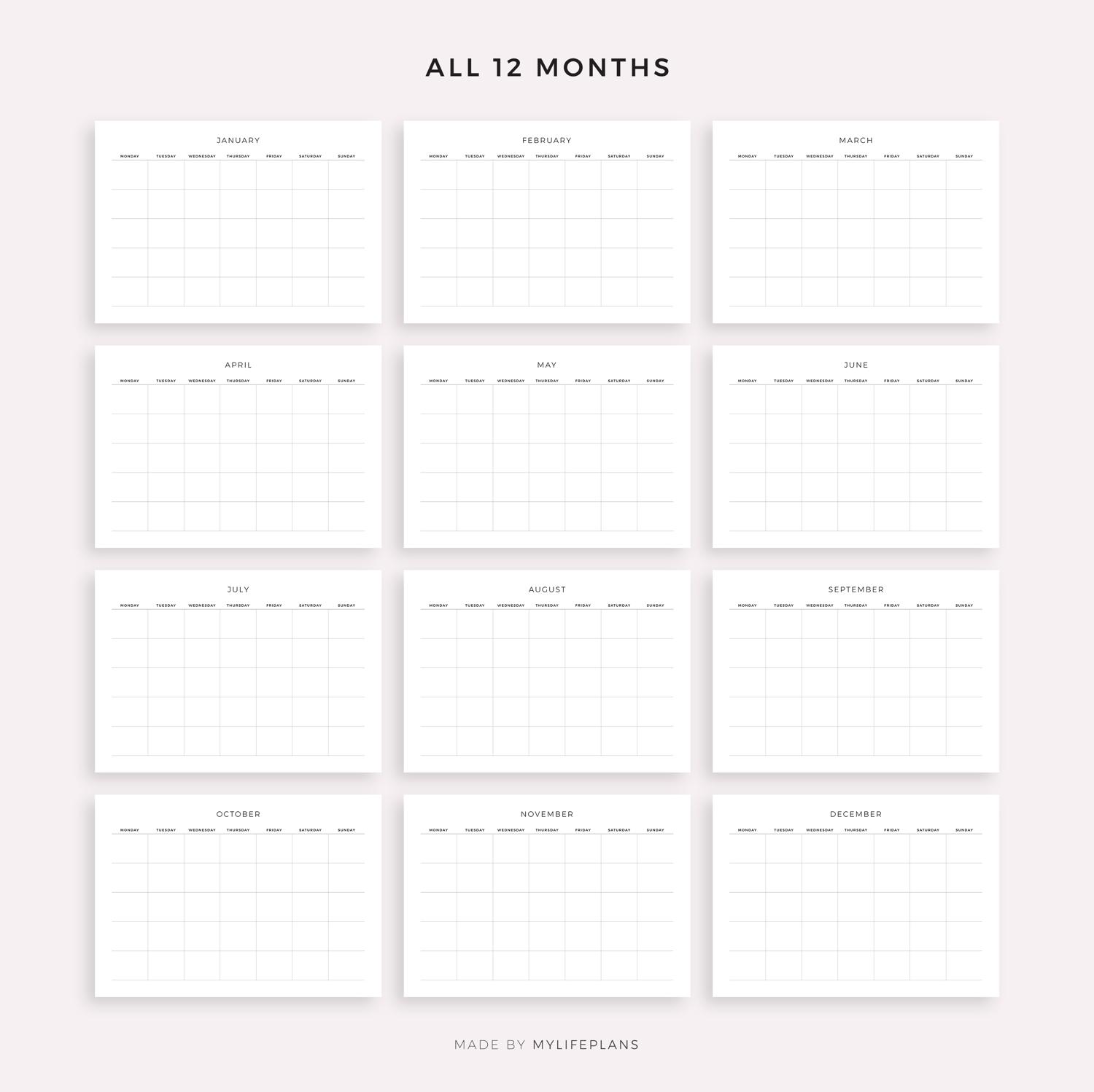 Undated 12 Months Calendar, Landscape, Printable & Fillable, A4/Letter Size