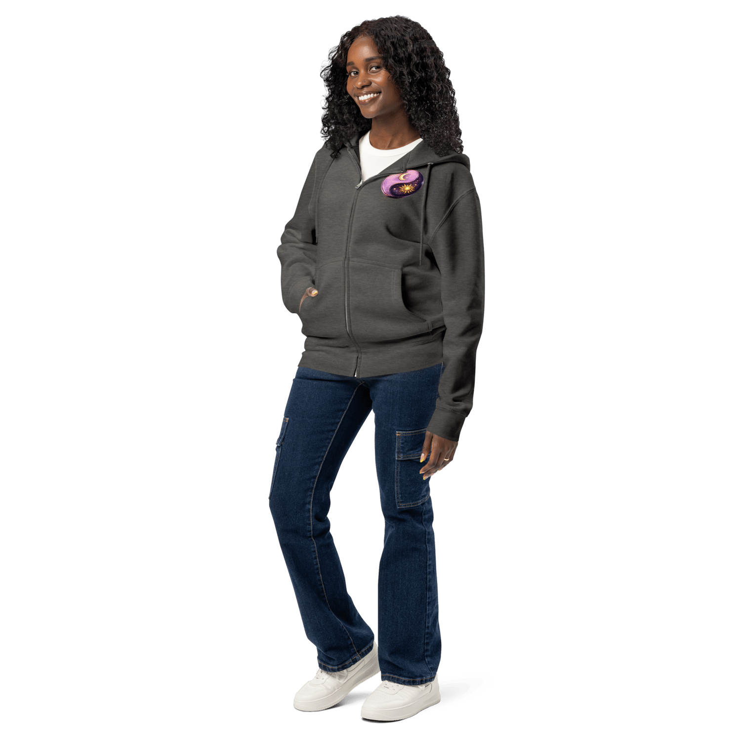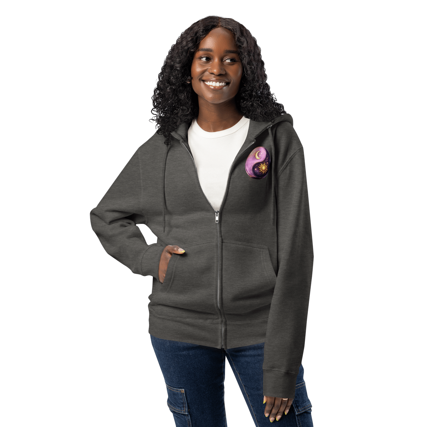 This charcoal full-zip hoodie features a subtle Sun & Moon yin-yang over the right chest and a small Centered Lotus Fitness logo across the upper back — understated details that make a statement without trying too hard.