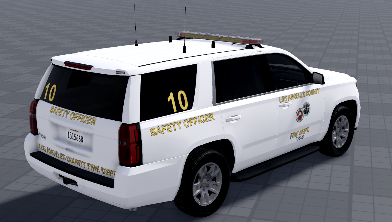 Based off of Los Angeles County Fire Department Safety Officer 10. The livery and ELS is 99% accurate to real life. This includes 3 stages of ELS and 3 stages of directionals. Credit to mortuium for the CA Exempt plates.