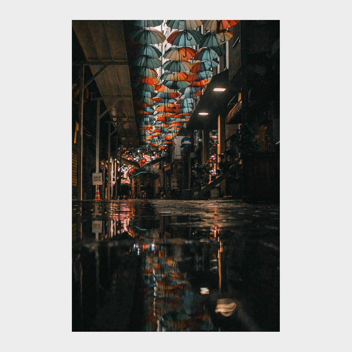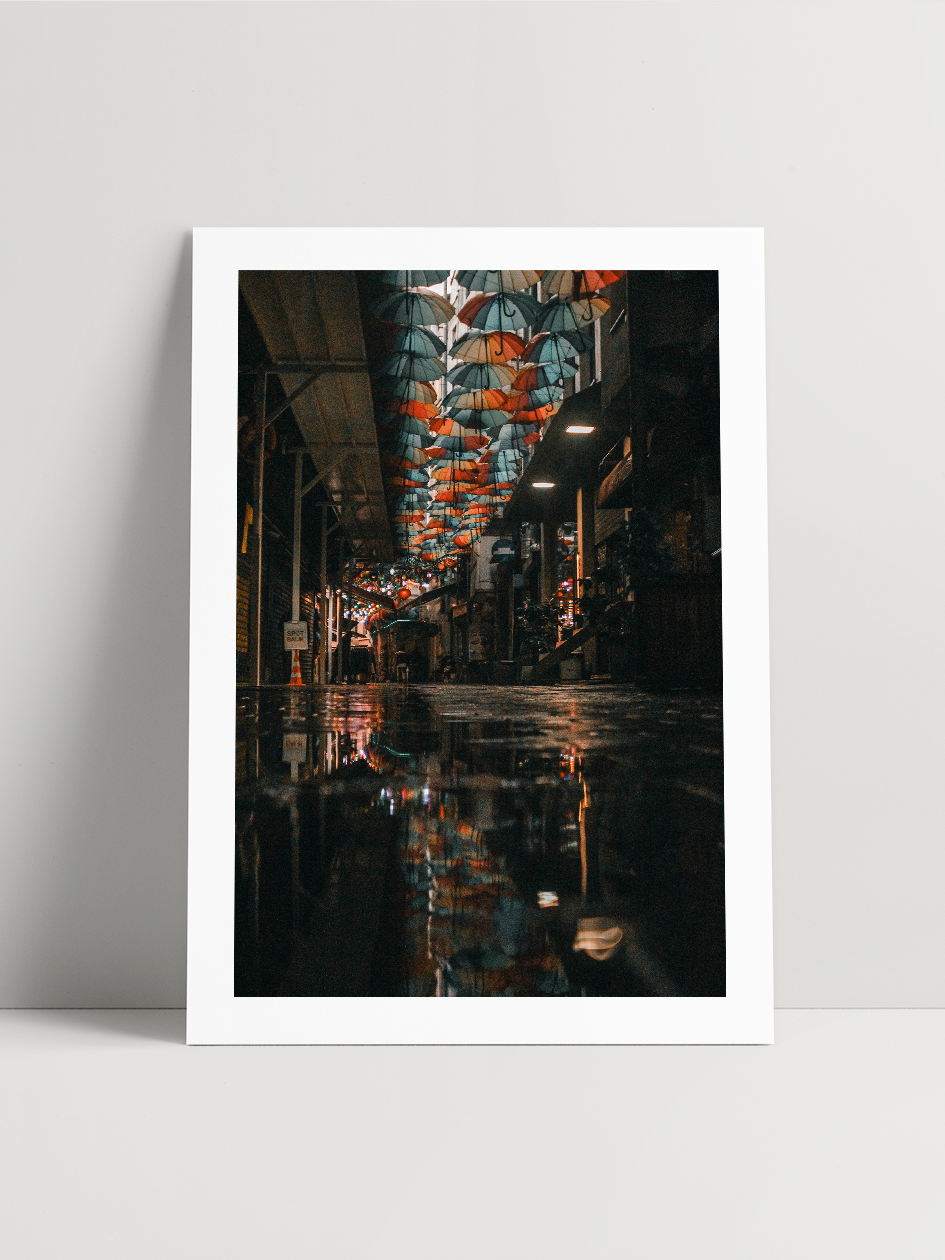 Au-dessus de moi, une centaines de parapluies multicolores étaient suspendus entre les immeubles, formant un plafond poétique. Quelques instants plus tôt, la pluie était tombée, laissant au sol une flaque d’eau coincée entre les pavés. En m’accroupissant, j’ai découvert que les parapluies se reflétaient parfaitement à sa surface, doublant la scène comme un monde inversé.