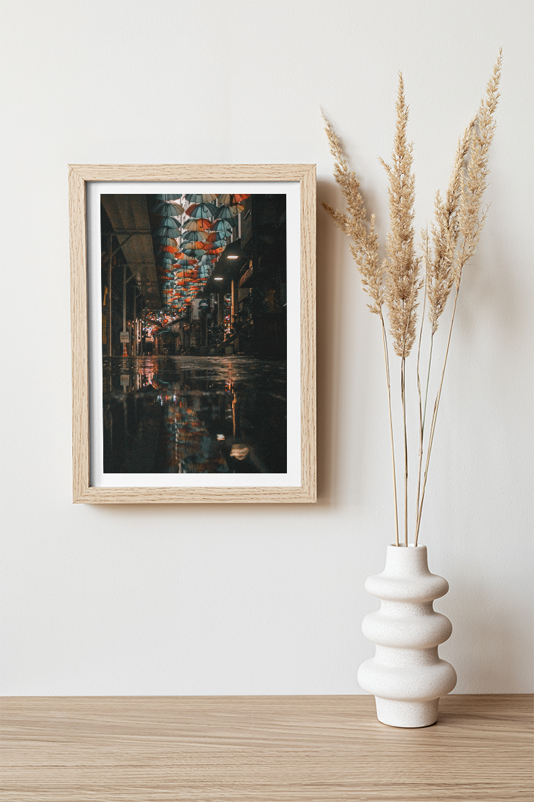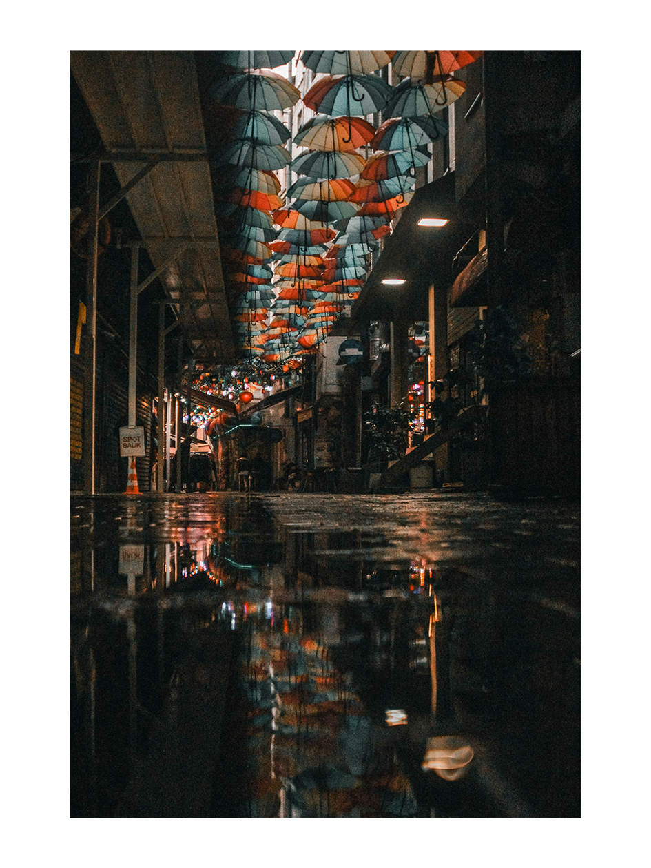 Perdue dans une ruelle du nord d’Istanbul, cette scène est née d’une errance volontaire, appareil photo en main. À la tombée du jour, une rue dédiée à la photographie se vide peu à peu, ses boutiques fermant leurs portes. Au-dessus, des centaines de parapluies colorés suspendus entre les immeubles transforment l’espace. Après la pluie, leur reflet apparaît dans une flaque au ras du sol, créant une image presque irréelle. Une parenthèse calme dans une ville pourtant toujours en mouvement.