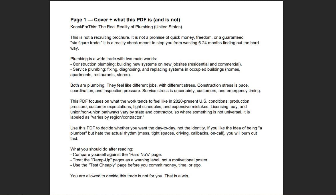 The Real Reality of Plumbing is a 20-page, evidence-based deep dive for adults considering plumbing as a first trade or a career change. It is not recruiting material. It does not promise stability, high pay, or satisfaction. It exists to help you decide before you commit years of time, money, and physical wear.