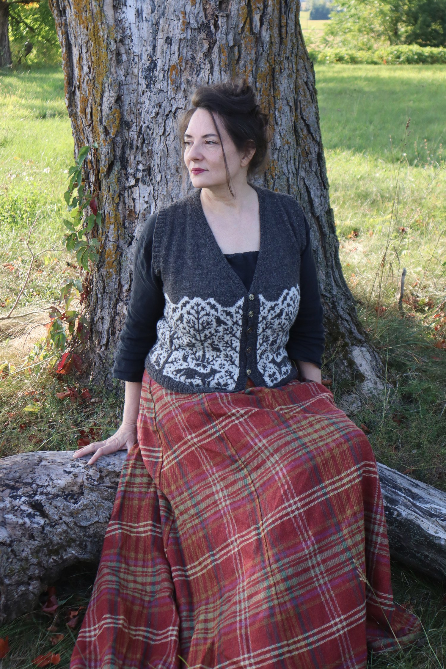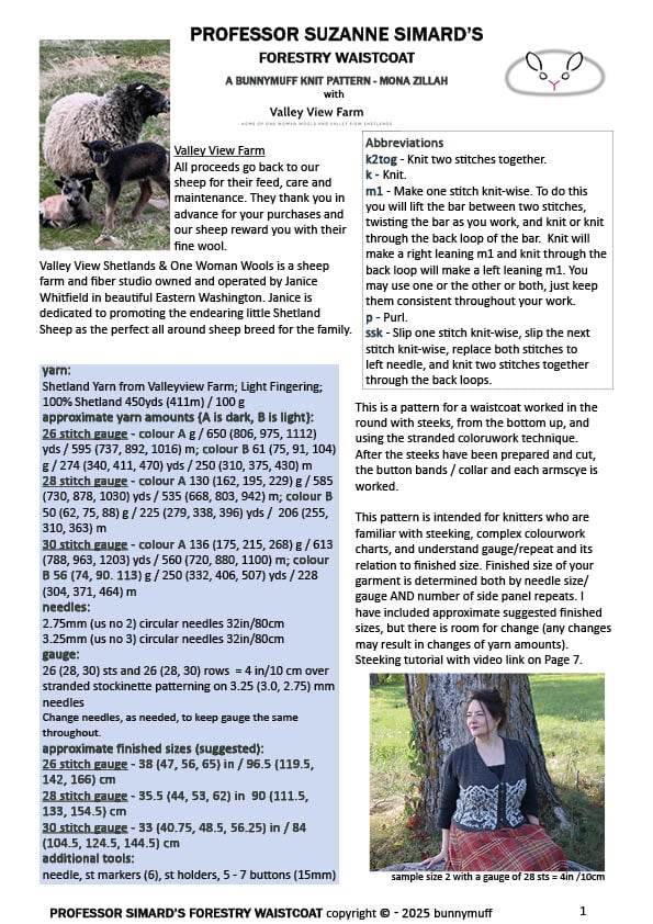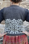This is a pattern for a waistcoat worked in the round with steeks, from the bottom up, and using the stranded coloruwork technique. After the steeks have been prepared and cut, the button bands / collar and each armscye is worked.