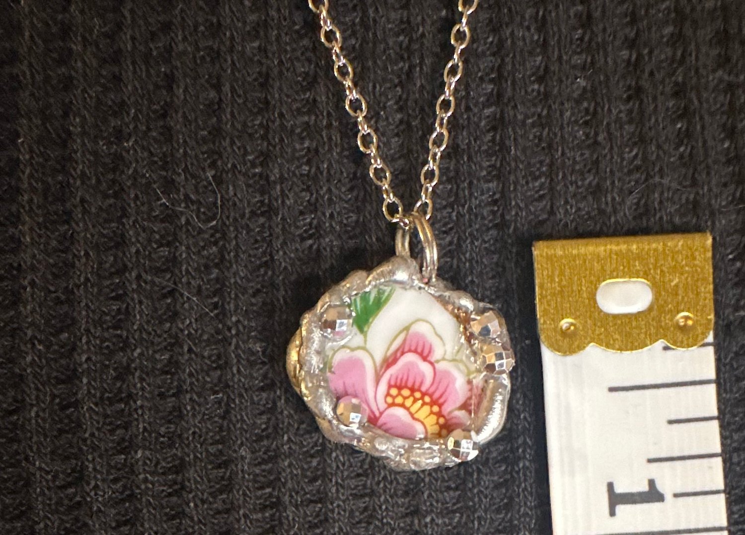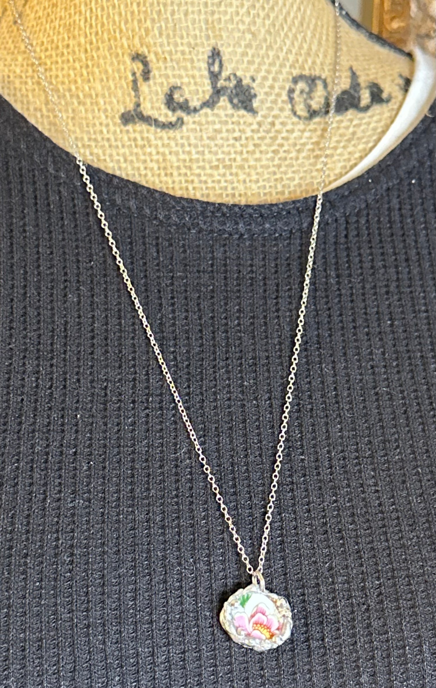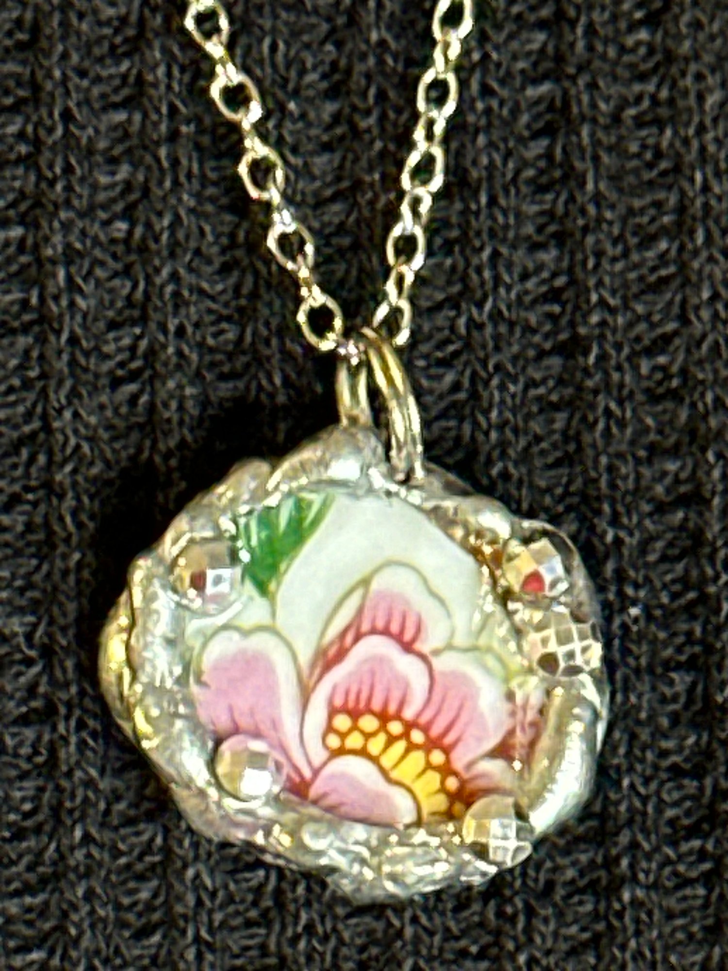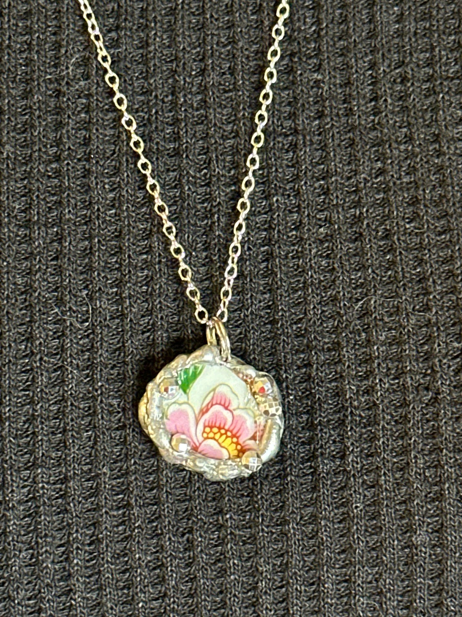 This charming necklace is made from a hand-cut shard of vintage china featuring a bold pink flower with soft yellow and green accents. The oval-shaped pendant is framed in silver solder with faceted bead details, creating a sparkling finish that highlights the delicate floral motif. Small but striking, itβs perfect for adding a touch of color and vintage charm to any outfit.