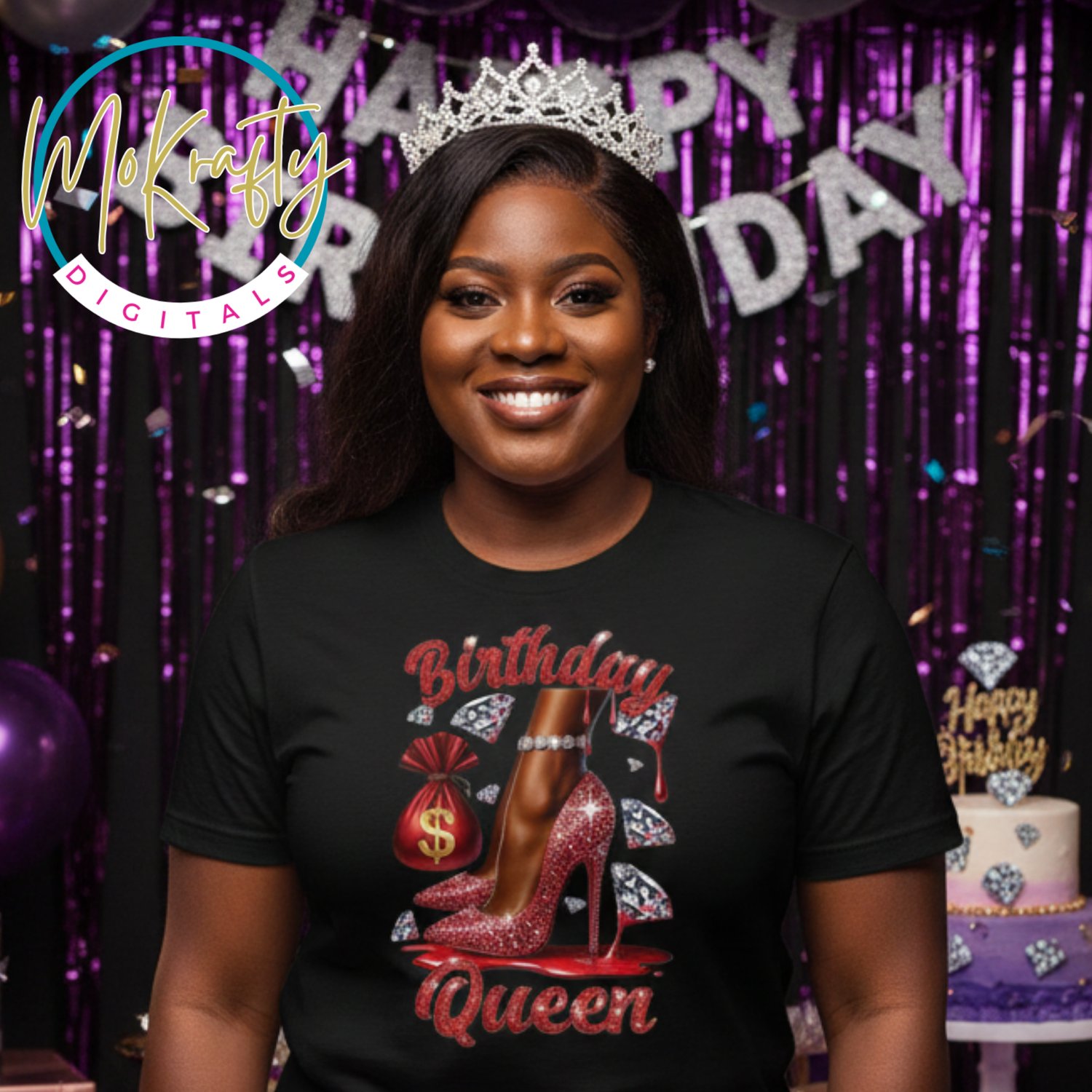 Make a statement with this glam Birthday Queen heels design. Perfect for bold birthday shirts, hoodies, tumblers, and party merch. High-resolution PNG with transparent background, ready for DTF and sublimation printing.