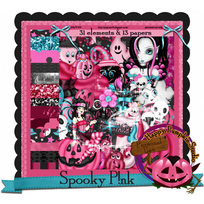 31 Elements NO repeats. 13 differen papers. Large tagger size , 300 DPI. My good friend Millie LOVES the colour pink. So I made her this halloween kit with her fave colour lol. It works well with a lot of tubes.