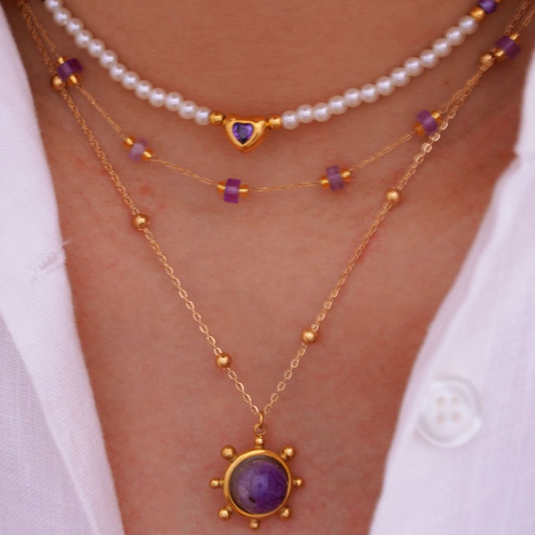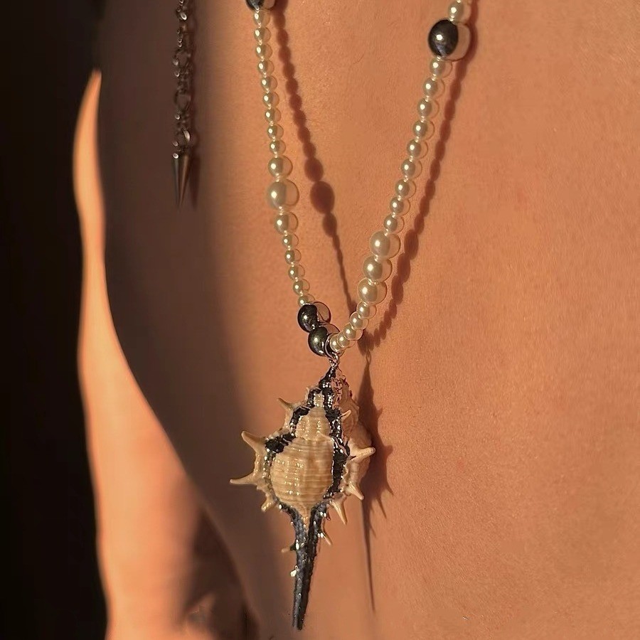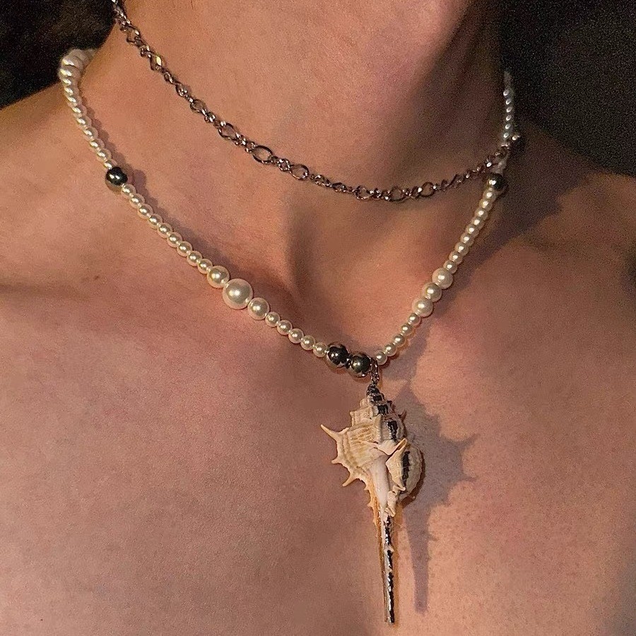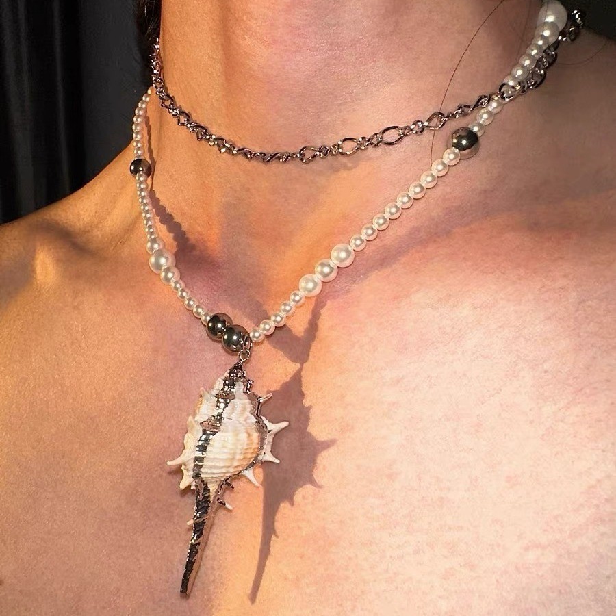 French handmade beaded titanium steel conch pearl shell stacking necklace