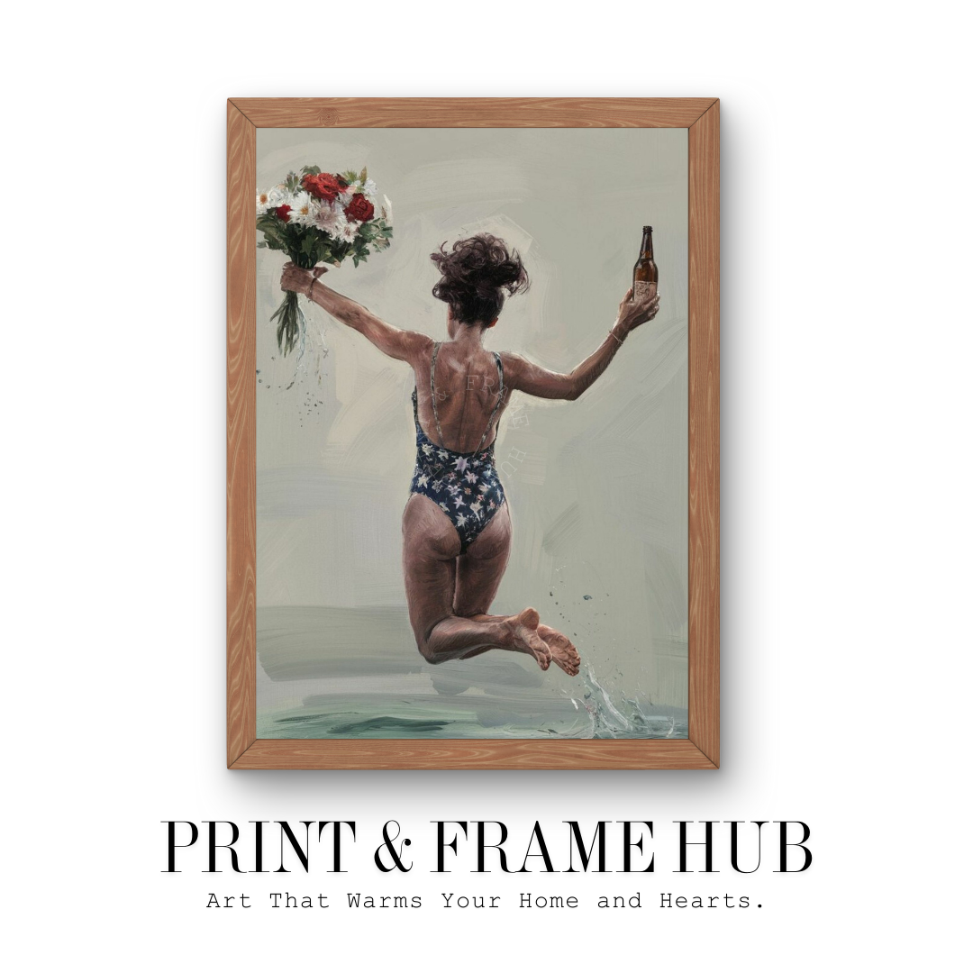 This painting depicts a joyous woman jumping into the water, holding flowers and a bottle. The dynamic pose and vibrant colors convey freedom and celebration, making it a perfect addition to any wall for a lively and uplifting atmosphere.