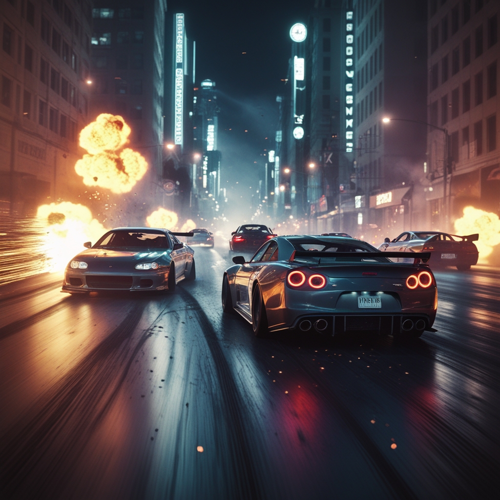 “A high-octane, cinematic scene inspired by The Fast and the Furious, featuring sleek, modified sports cars racing through a neon-lit city at night. Tires screech as cars drift around sharp corners, leaving trails of sparks and smoke. Explosions and glowing streetlights reflect off polished car surfaces. The drivers are intense and focused, while dynamic camera angles capture motion blur, speed, and adrenaline. Ultra-realistic, dramatic lighting, cinematic depth, and a thrilling action-packed atmosphere.”