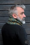 Katara Compagne is a sideways knit cowl or scarf. It uses short row colourwork to create a motif of gently waving lengths of different lengths within one panel, which is then repeated all around. It’s worked in garter stitch throughout.