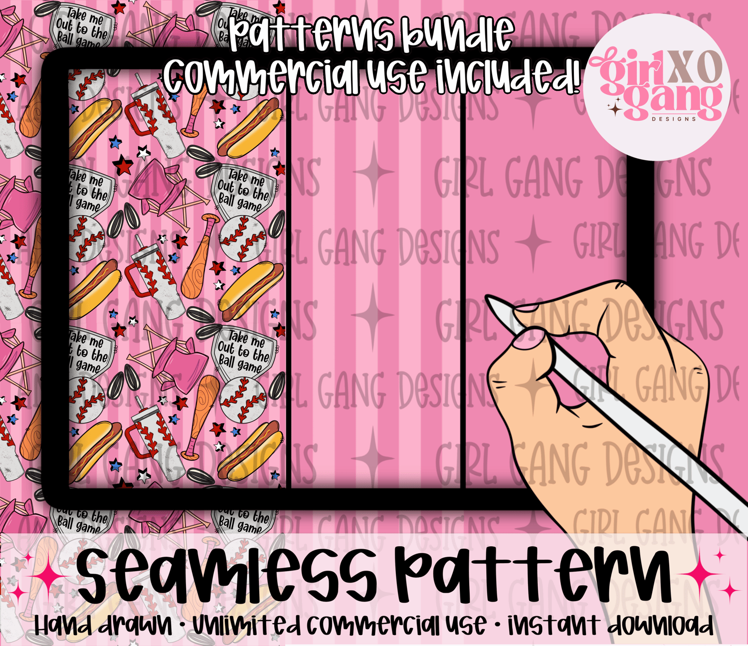 Pink doodle baseball seamless pattern bundle png seamless design bundle pink stripes, checkered 3 patterns included