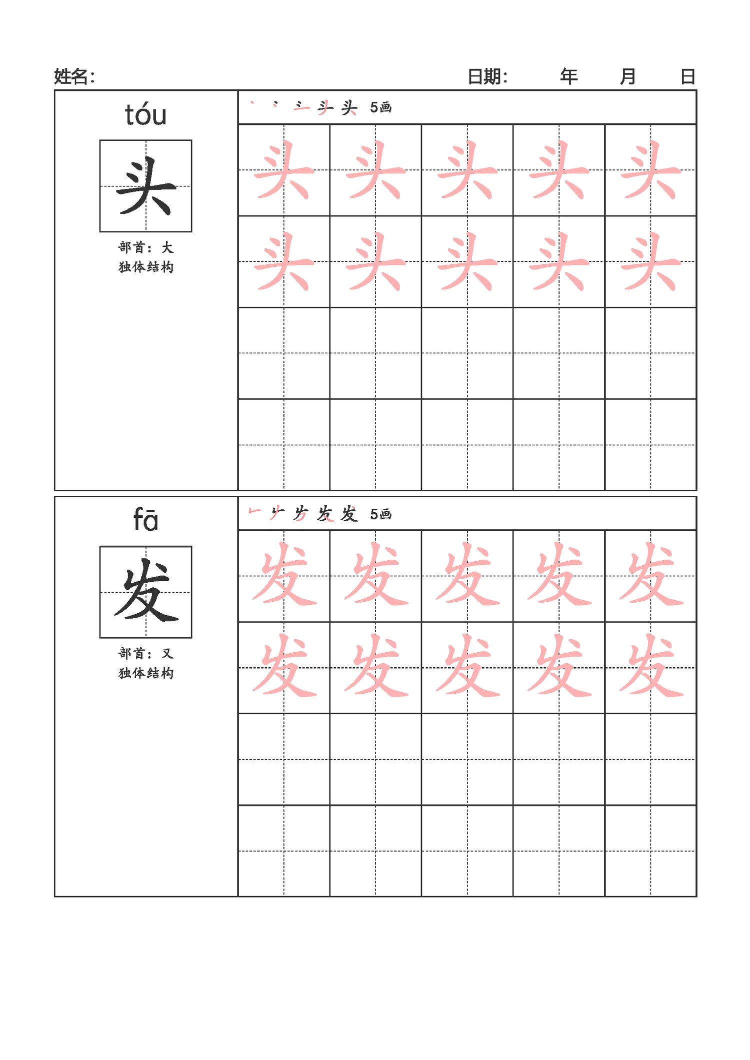 可打印汉字书写练习 - 身体部位:头发,眼睛,鼻子,嘴巴,耳朵