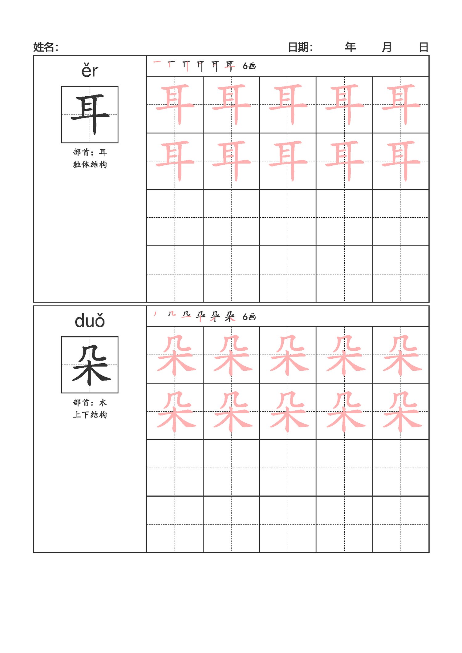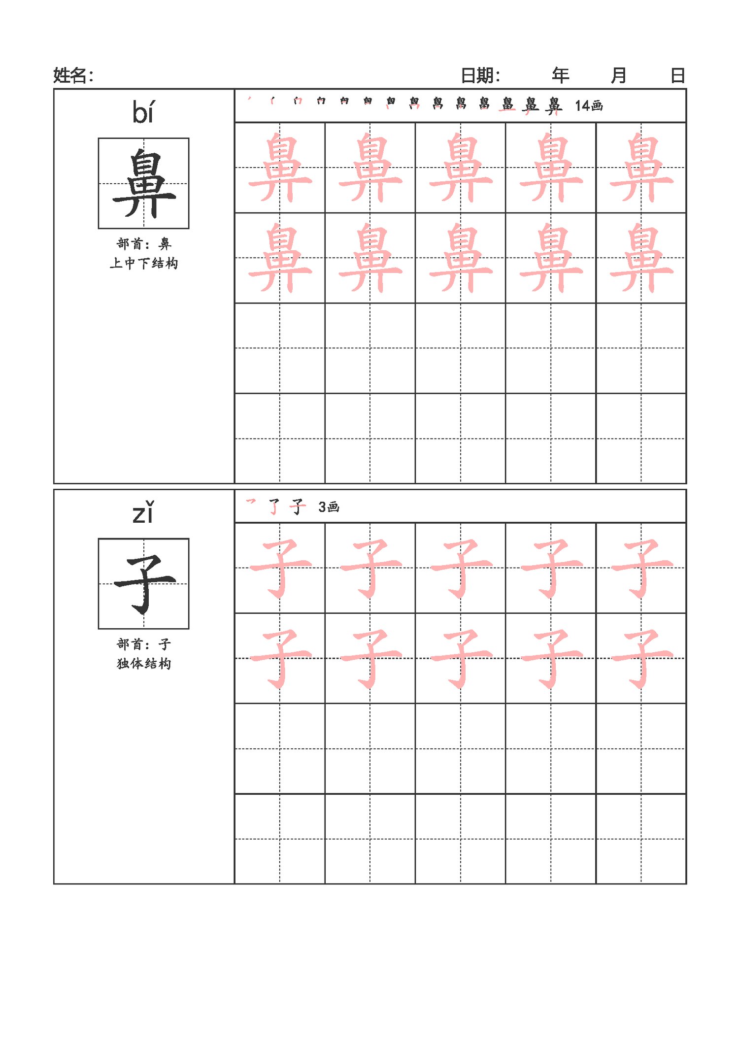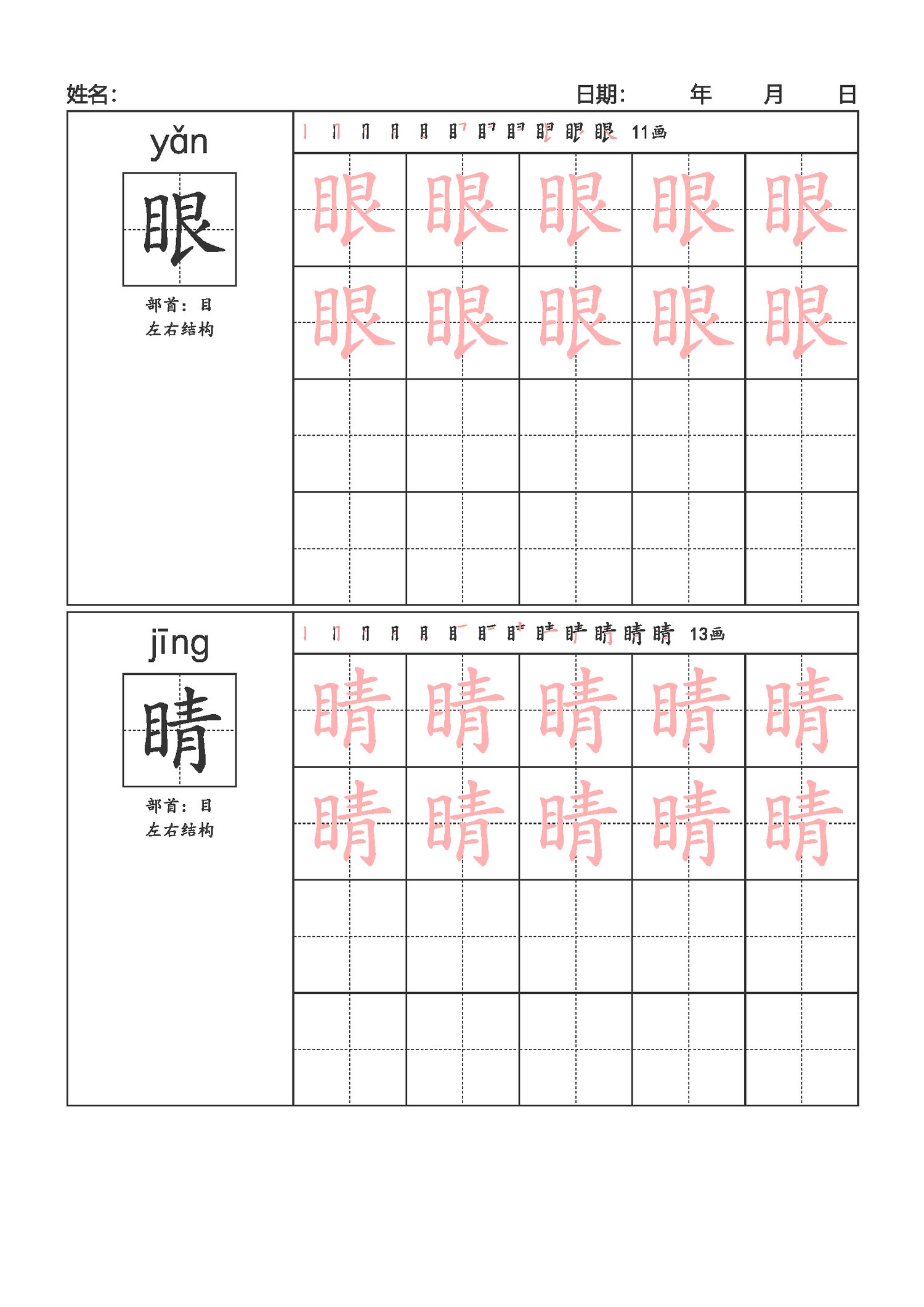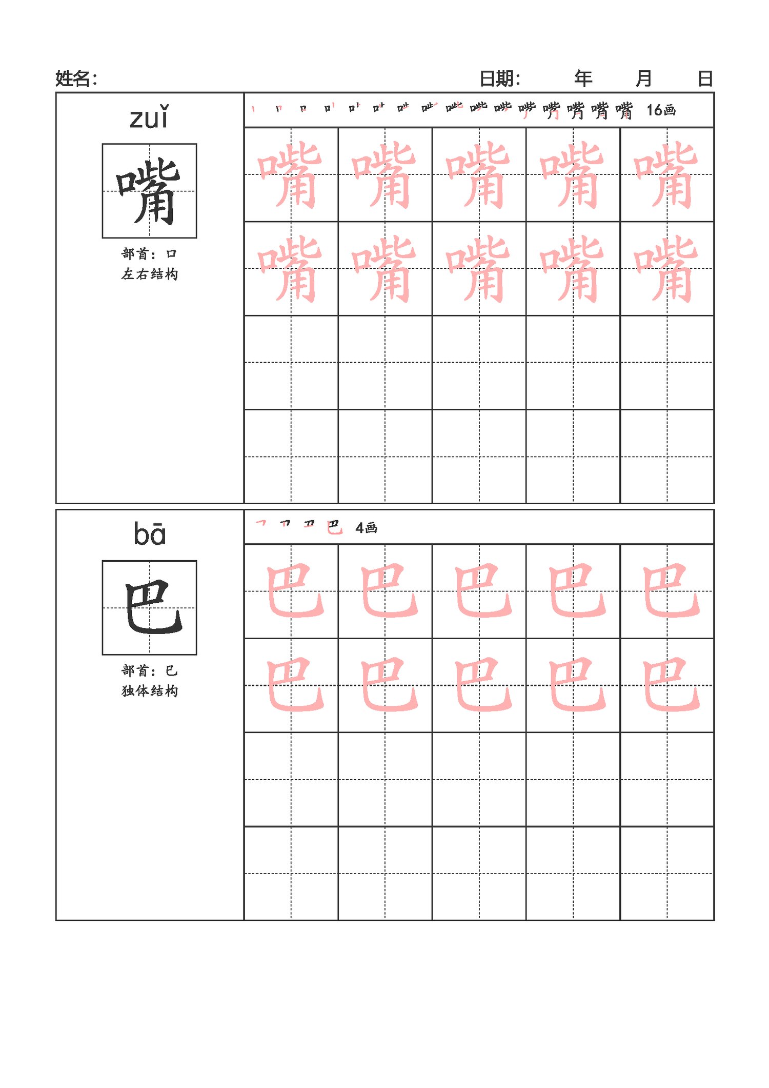Printable Chinese Character Handwriting Practice Sheet 可打印的汉字田字格手写练习题 - 头发,眼睛,鼻子,嘴巴,耳朵