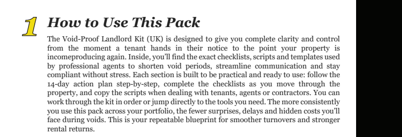 The Void-Proof Landlord Kit (UK) gives you the exact checklists, templates and scripts used by professional property managers to take control the moment a tenant leaves, stay compliant, and re-let faster — without stress, confusion or missed steps.