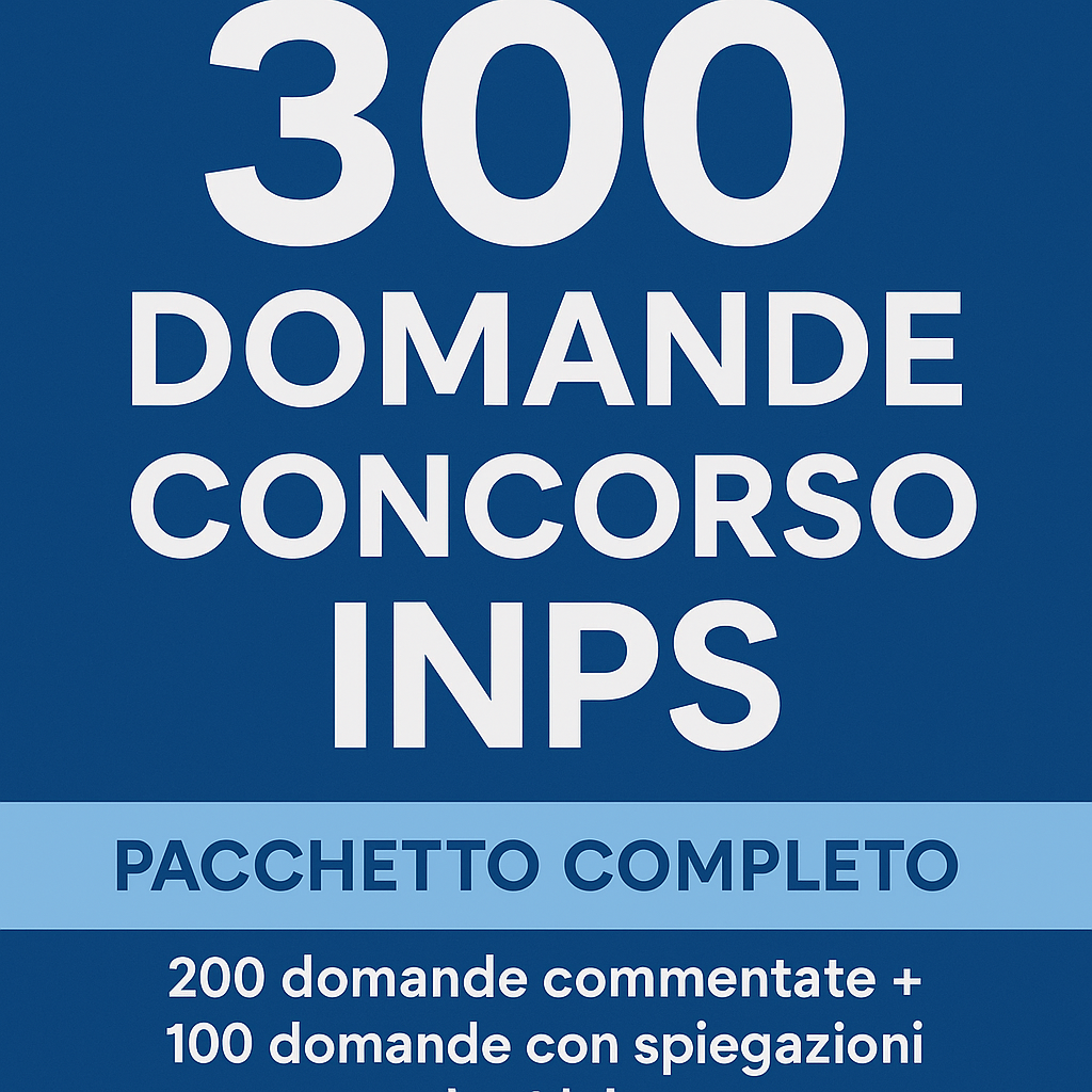 Preparati al Concorso INPS 2025 con questa raccolta di 300 domande con risposta, ognuna accompagnata da spiegazioni complete, suddivise per materia:
