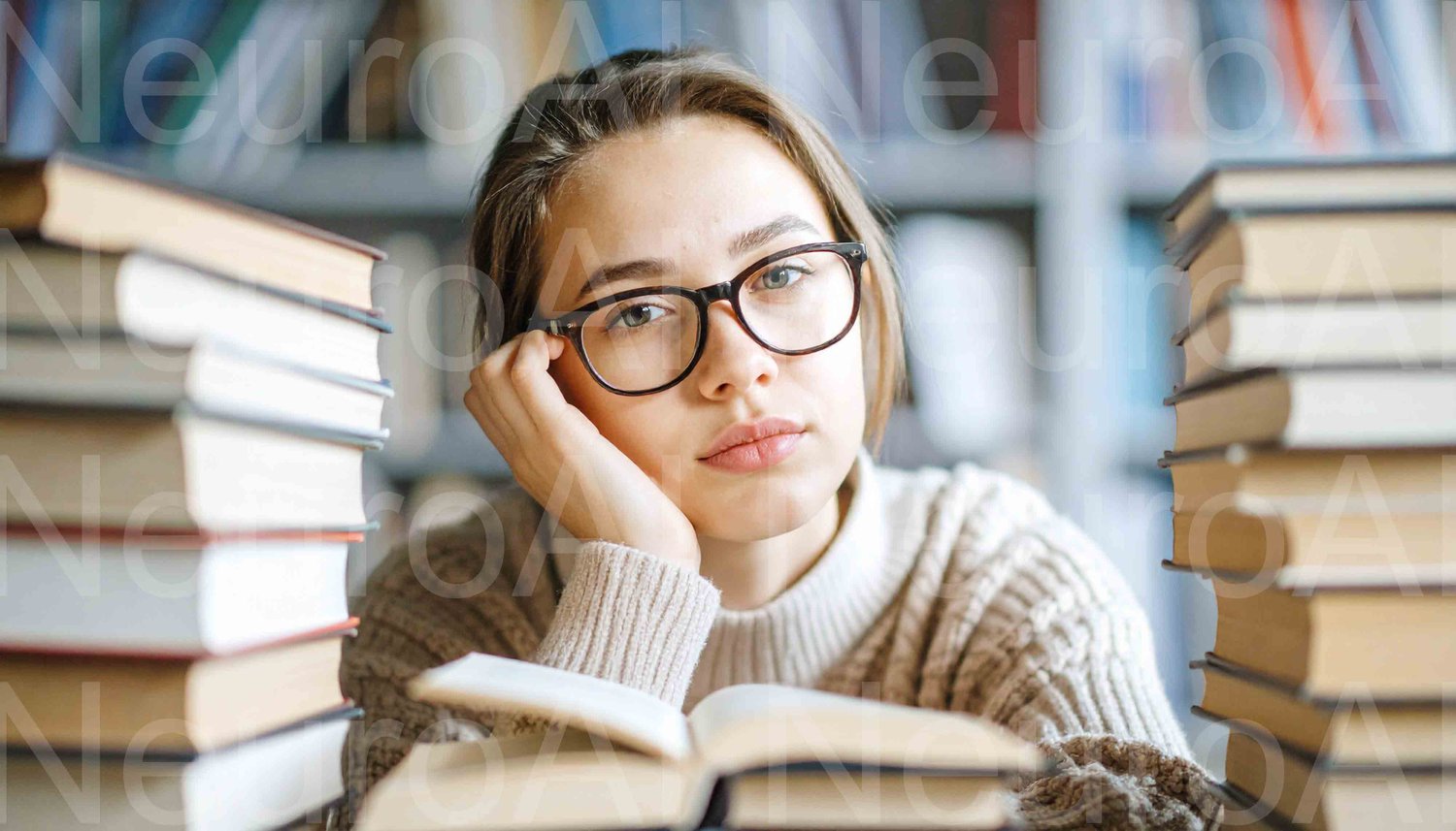 Young student engrossed in books, seeking knowledge in a cozy library setting