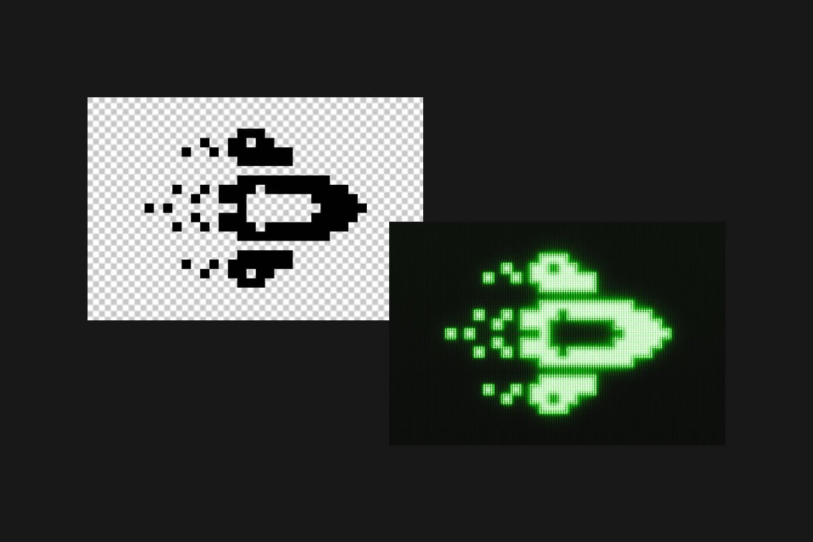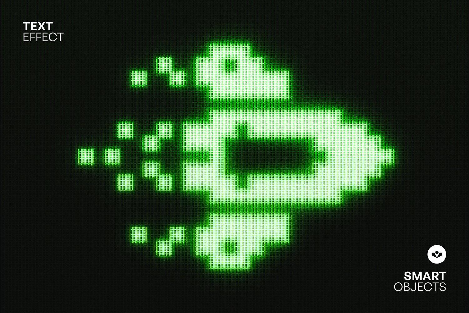 Glowing pixel-art style rendered in bright neon green against a dark background. The effect resembles an old CRT or LED digital display, with visible grid lines and soft glow edges around the pixels, giving a retro video game or sci-fi digital screen aesthetic.