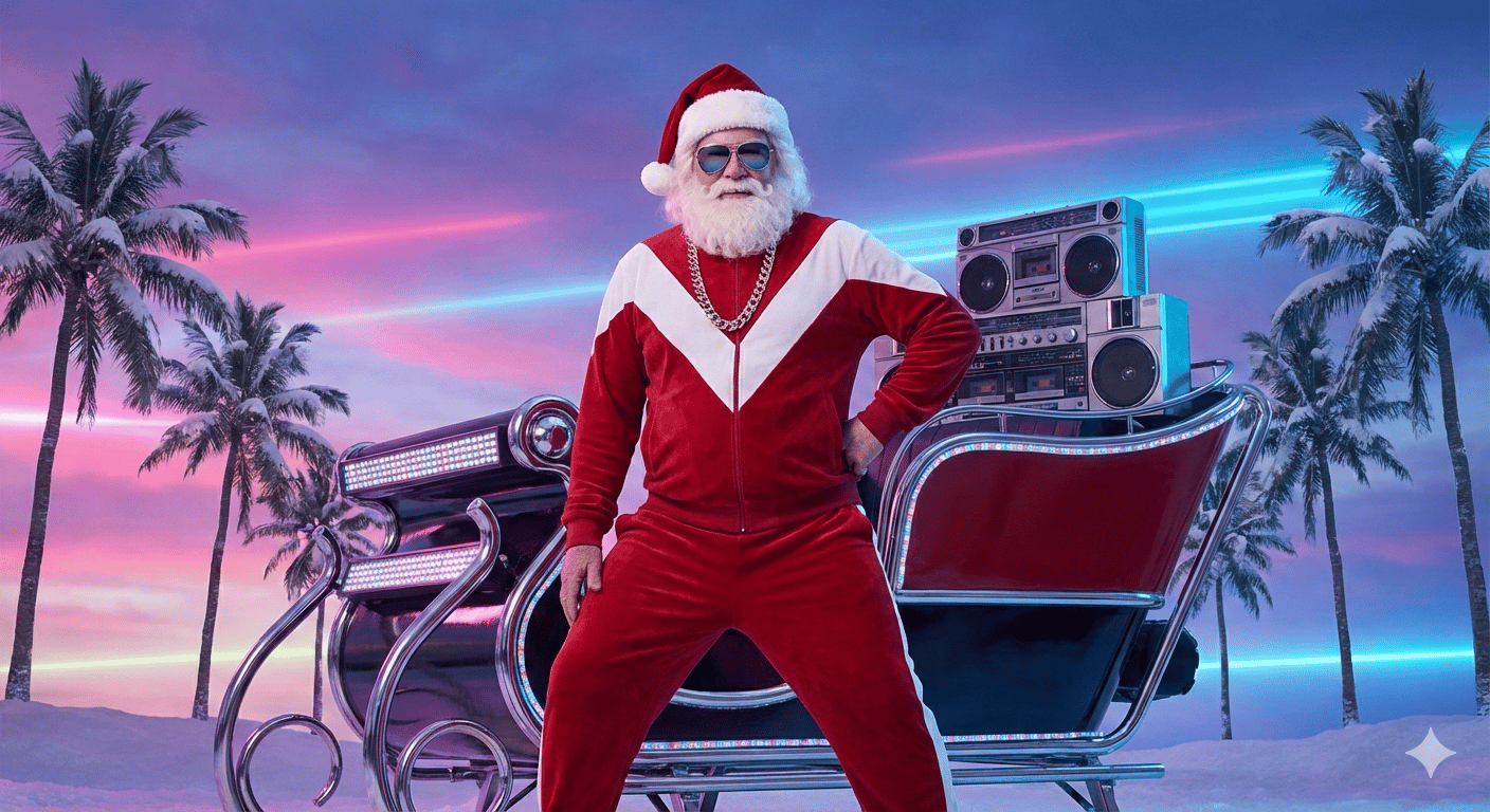 Inside, you’ll find 8 cinematic, ready-to-run AI prompts that reimagine Santa across bold styles and unexpected worlds—from cyberpunk streets and fantasy kingdoms to retro neon skies and sun-soaked beaches.