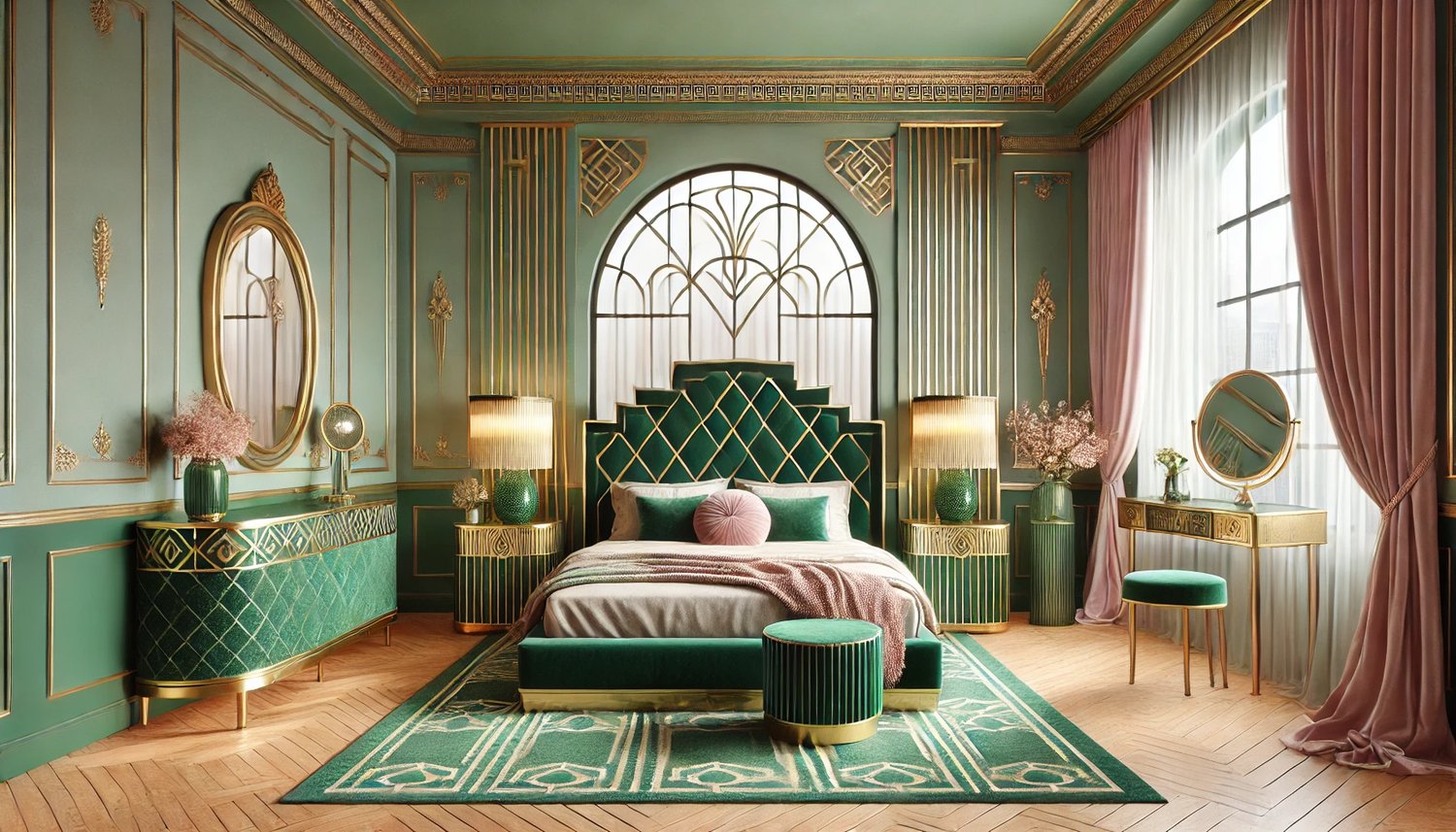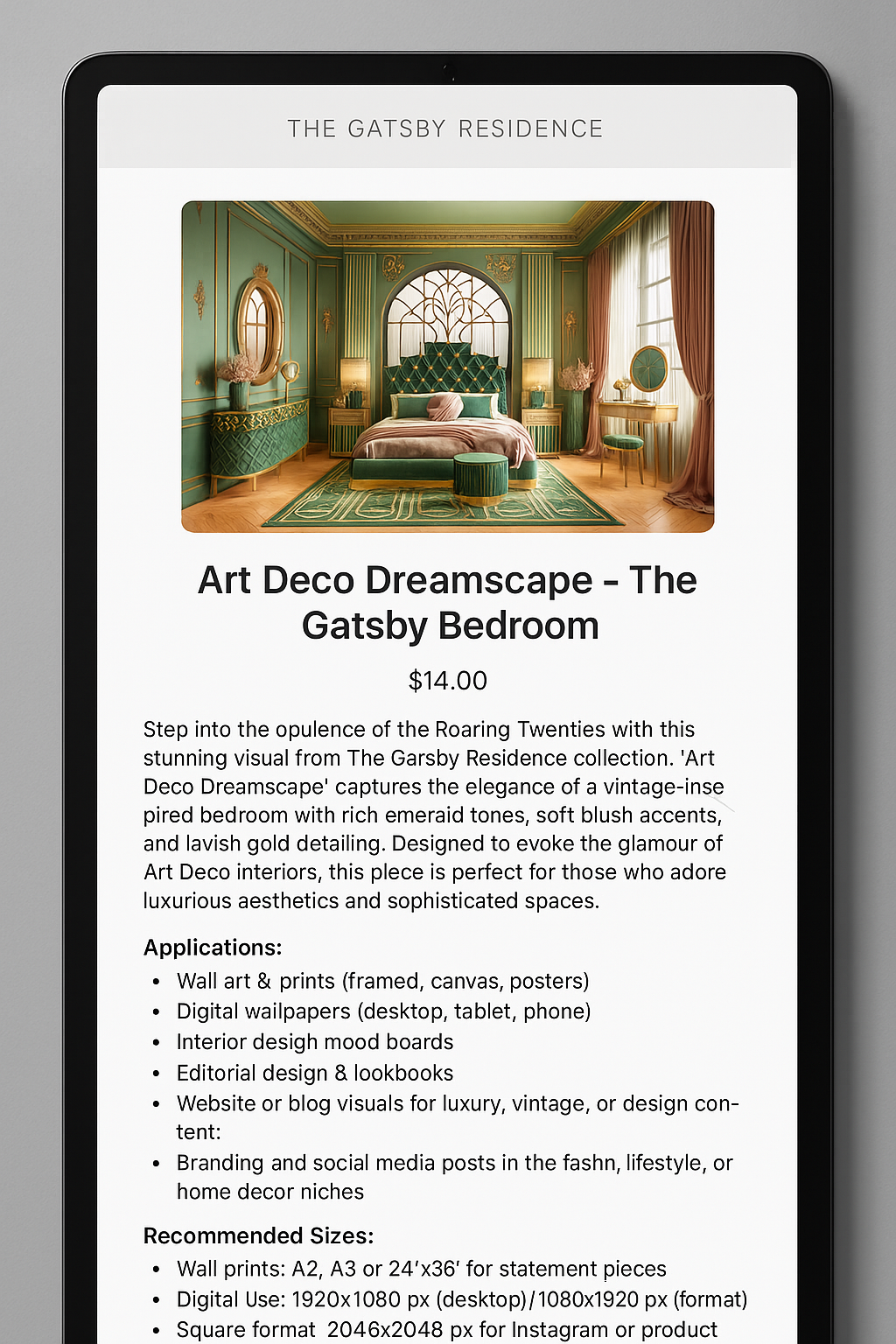 Step into the opulence of the Roaring Twenties with this stunning visual from The Gatsby Residence collection. "Art Deco Dreamscape" captures the elegance of a vintage-inspired bedroom with rich emerald tones, soft blush accents, and lavish gold detailing. Designed to evoke the glamour of Art Deco interiors, this piece is perfect for those who adore luxurious aesthetics and sophisticated spaces.