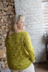 6 (6, 7)8, 9, 10 skeins of Malabrigo Silky Merino (50% merino, 50% silk; 150y / 50g). Sample was made in colorway 76 Manzanilla Olive.