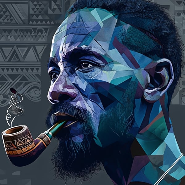 This 60x90cm high-resolution wall print captures the modern spirit of tradition—featuring a PNG man in a geometric abstract style, smoking a traditional carved pipe, surrounded by ancestral patterns.