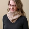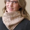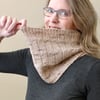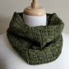 This easy cowl pattern uses only knit and purl stitches to achieve a textured look. Wide ribbing and purl stitch ‘diamonds’ provide visual interest. This one skein project is quick to knit in worsted weight yarn on a circular needle. Choose a beautiful colour and you’ll have a pretty cowl in no time at all!