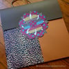 Keep your notepads, small books, documents, or other essentials organized in style with this handmade flat folder tote. Crafted from three coordinated cardstock colors — coffee brown flap, burgundy, deep orange, and a bold animal print — this tote is both eye-catching and functional. A unique floral craft detail doubles as a tuck-flap closure, securing items without a permanent seal. The rustic twine handles are reinforced with metal eyelets for durability and adjustable for comfortable carrying.