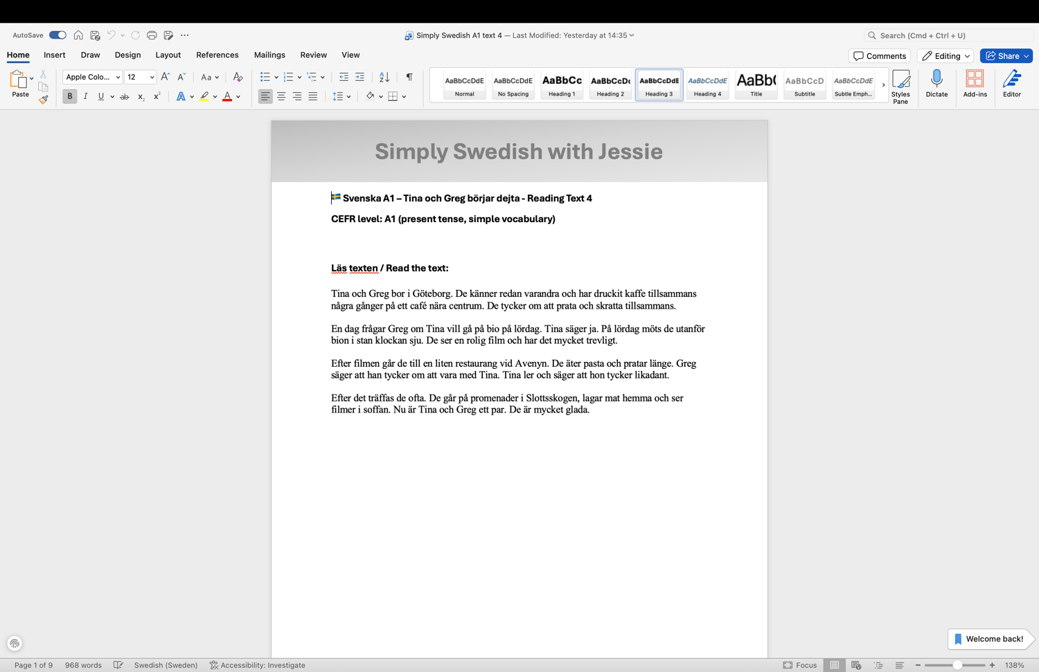 This beginner-friendly Swedish worksheet is designed for A1 learners and focuses on present tense verbs, everyday vocabulary, and reading comprehension through a short, engaging story.