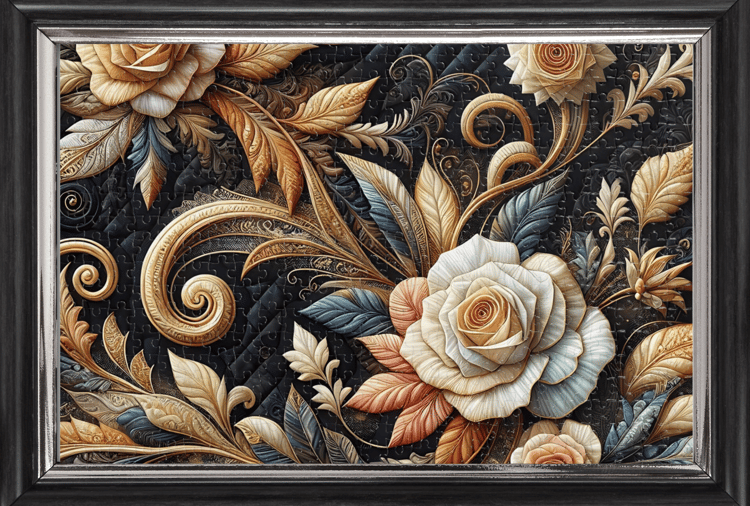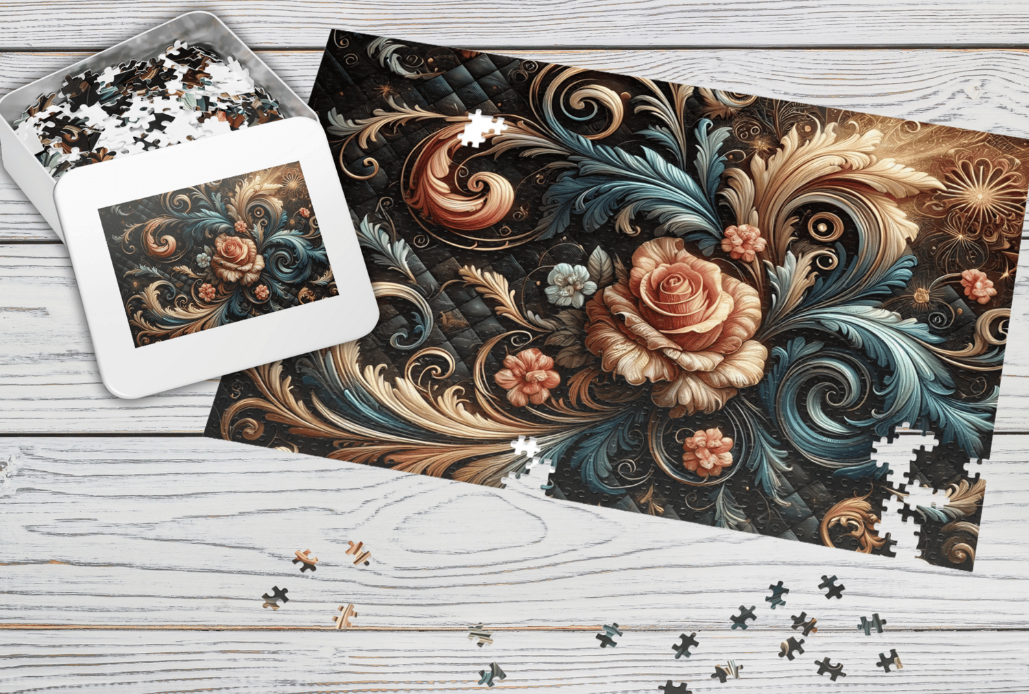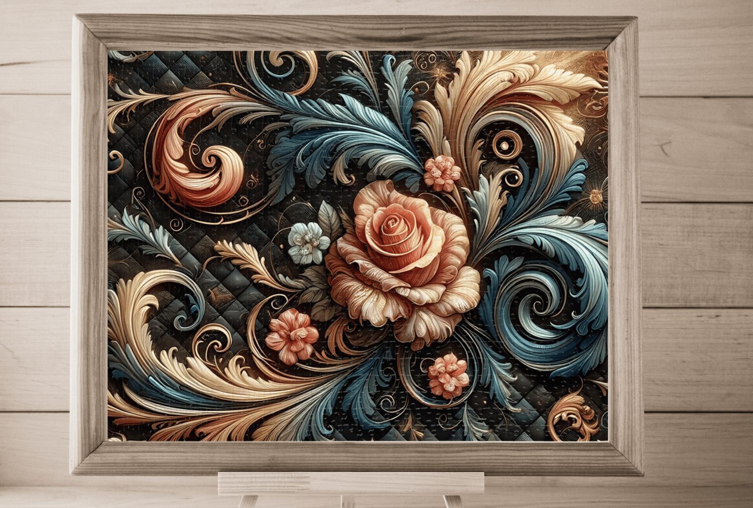 Step into the world of classical artistry with "Eternal Elegance The Baroque Tapestry Puzzle," a lavish and complex jigsaw puzzle that captures the essence of the Baroque era. Available in both 1000-piece and 500-piece editions, this puzzle presents a rich tapestry of ornamental swirls, flourishing acanthus leaves, and a medley of delicate flowers centered around a majestic rose, all set against a textured, quilt-like background. Each piece is a miniature gateway to the past, intricately cut to ensure a satisfying fit and an immersive building experience. The 1000-piece variant offers a challenging and intricate adventure, perfect for seasoned puzzle enthusiasts, while the 500-piece version provides a more accessible yet equally enjoyable experience. Whether you're a lover of art history, a puzzle aficionado, or simply looking for an elegant pastime, "Eternal Elegance" will delight your senses and test your skills, piece by piece.