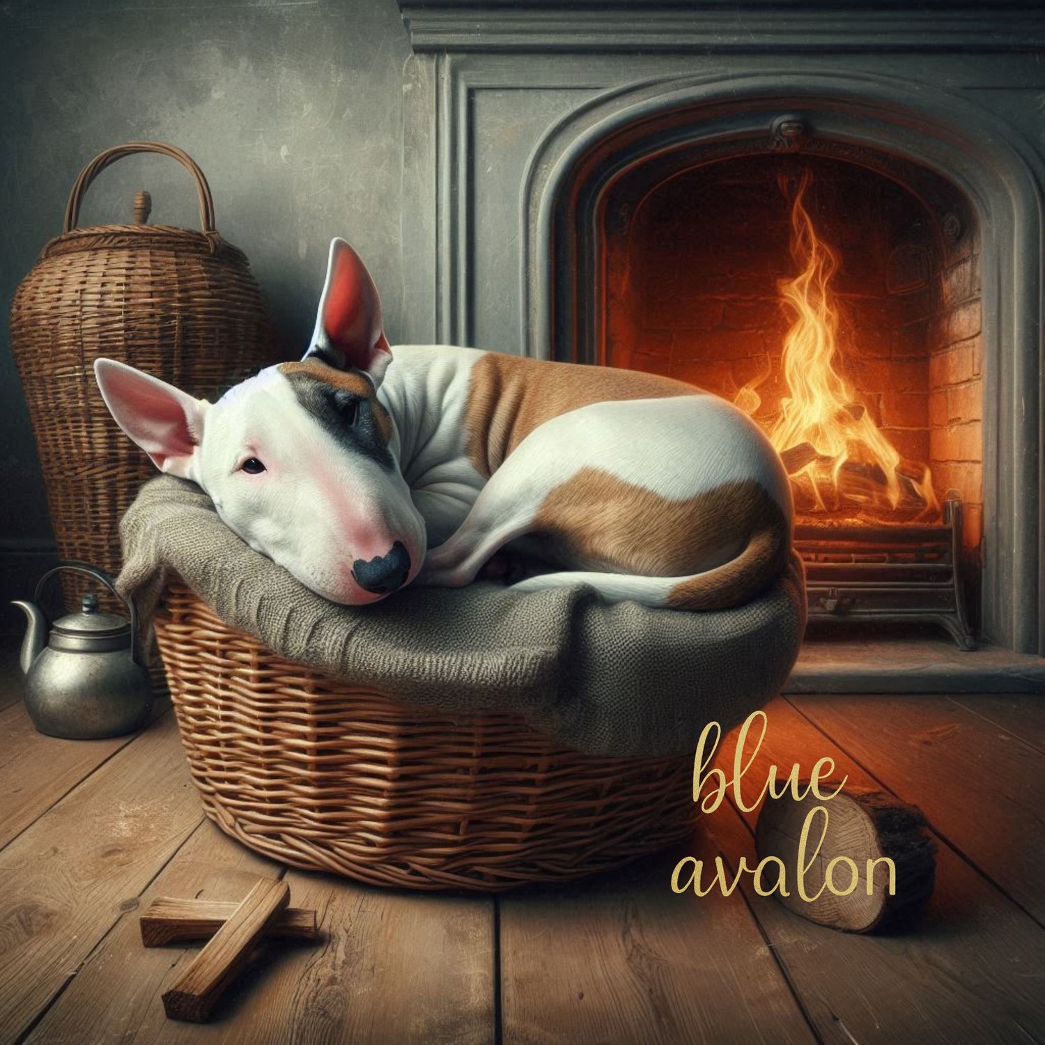 This heartwarming image features a British Bull Terrier curled up snugly in a basket, resting peacefully in front of a glowing fireplace. The scene is cosy and comforting, reminiscent of bygone days of warmth, home and quiet companionship. With rich tones and its gentle vibe, it's the perfect artwork for dog lovers or anyone drawn to homely, rustic charm.