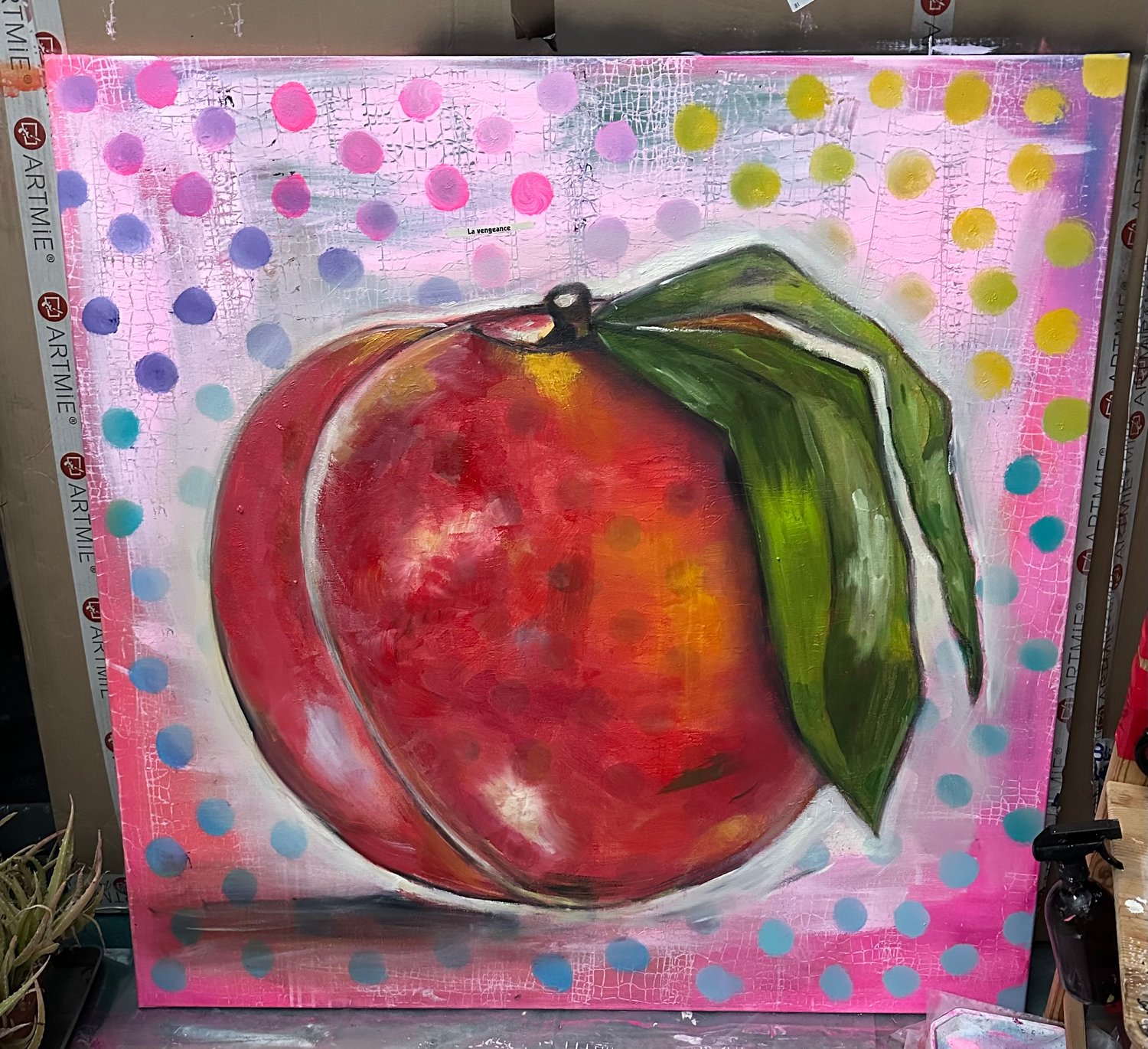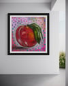 Bold and captivating, La Vengeance is a dynamic work by contemporary artist Zita Monori-Monory, celebrated for her vibrant palette and playful yet thought-provoking compositions. This striking piece features a richly hued peach, symbolizing both sweetness and defiance, set against a vivid polka-dotted background of pinks, purples, and blues. The lush green leaves add a dramatic contrast, enhancing the piece’s visual intensity.