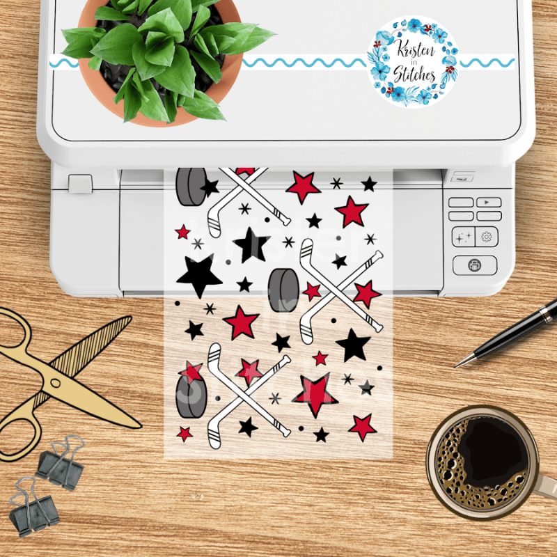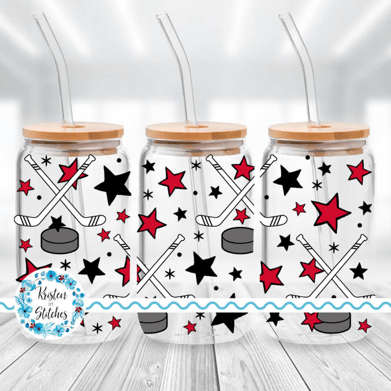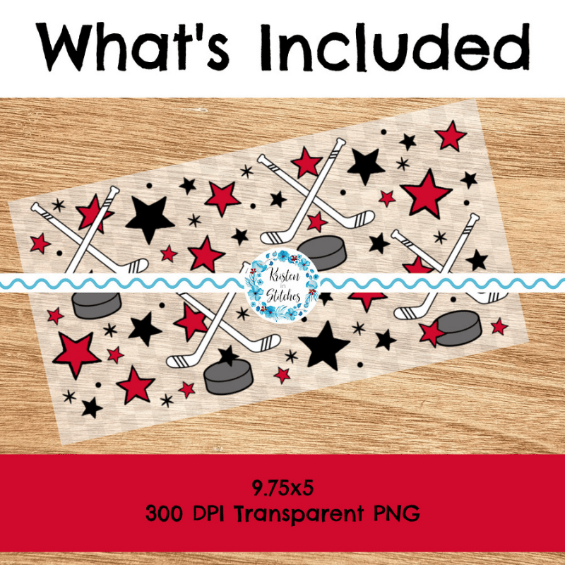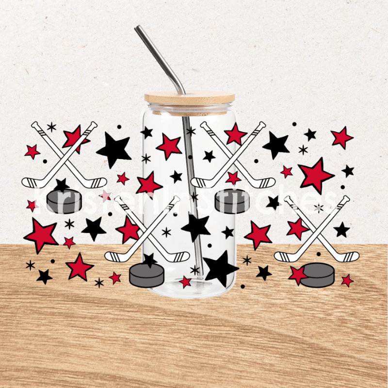 Features hockey sticks, pucks and stars.