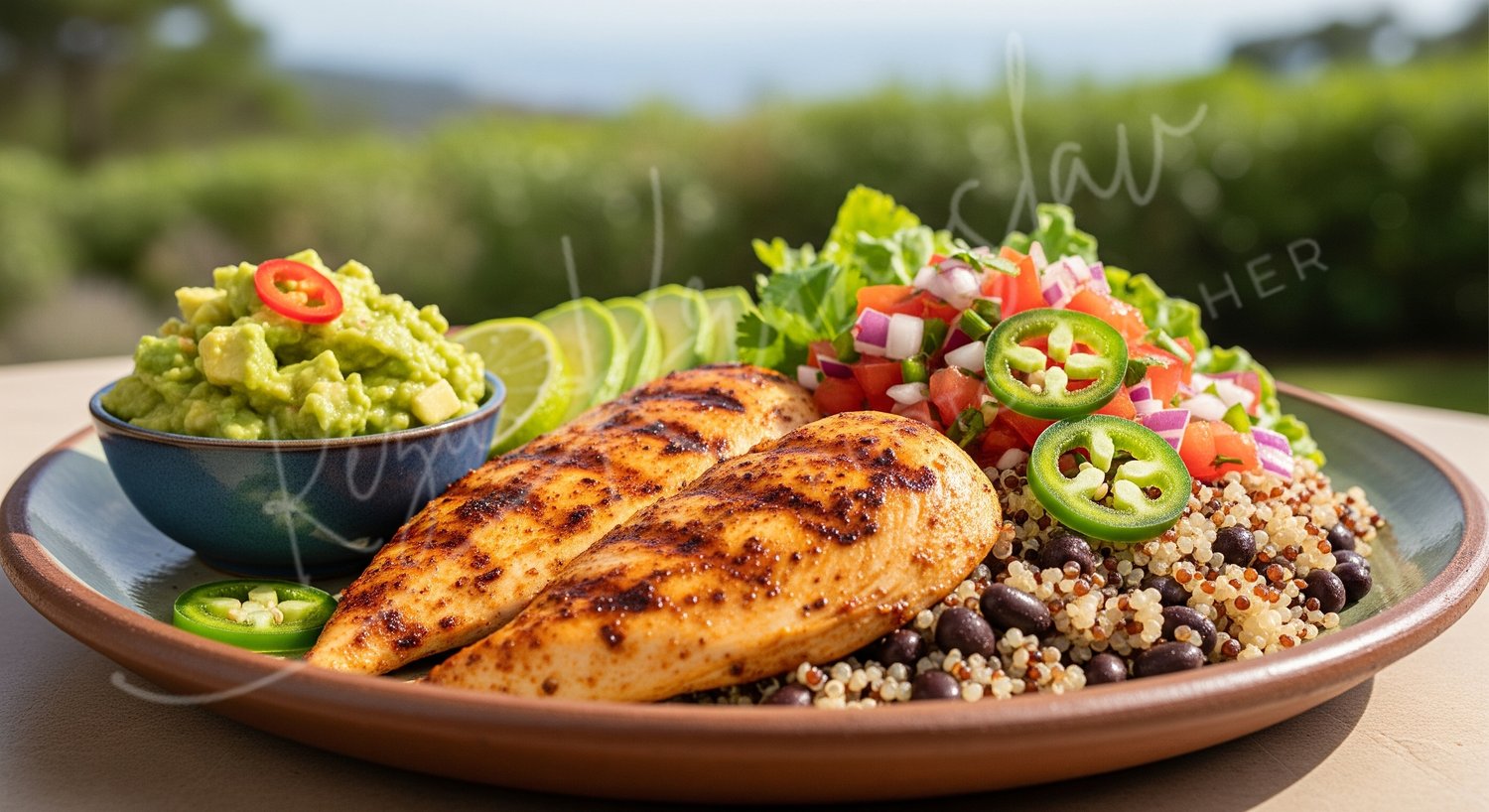 Mexican grilled chicken breast with quinoa, black beans, fresh salsa, and a bowl of guacamole, garnished with lime and jalapeños, sunny outdoor lighting.