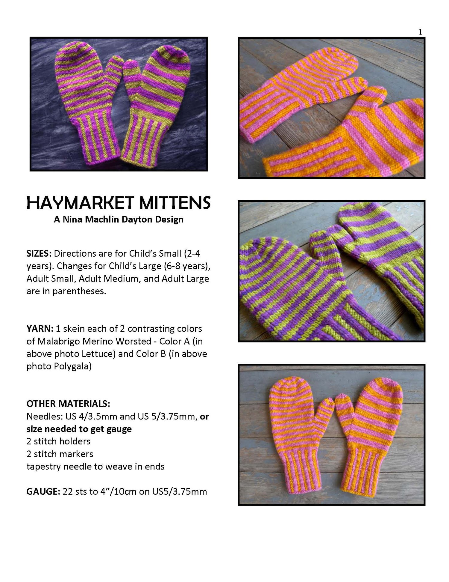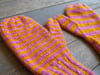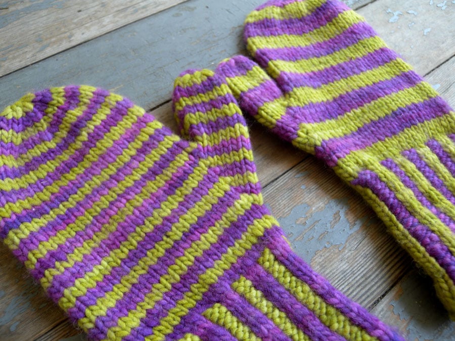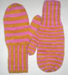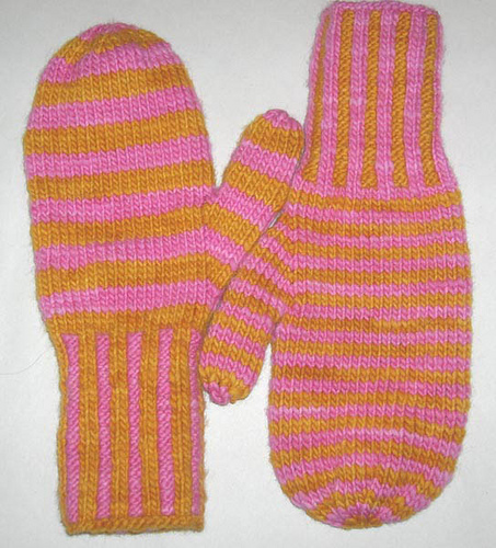 Colorful mittens, knit on two needles, and seamed. Easy enough for beginning color work, but challenging enough to hold the interest of an experienced knitter.