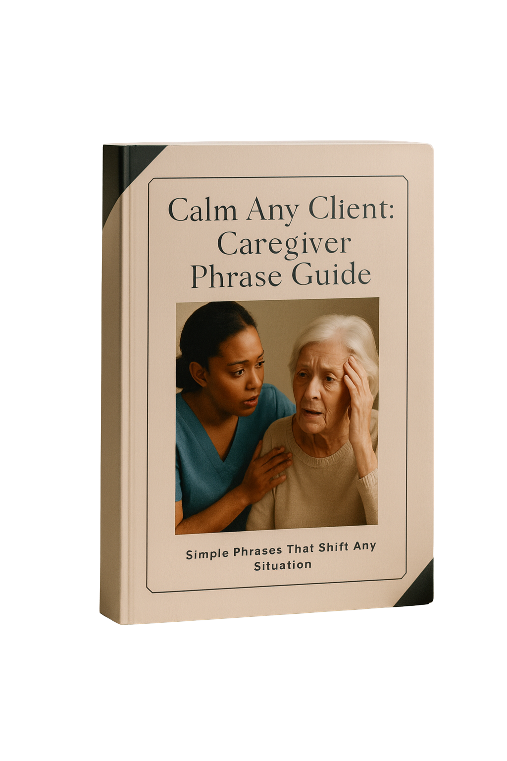 This is a simple but helpful guide that helps caregivers handle stressful moments with confidence and calm. Inside, you will learn phrases and communication methods that reduce tension, prevent arguments, and create a peaceful visit for you and the client.