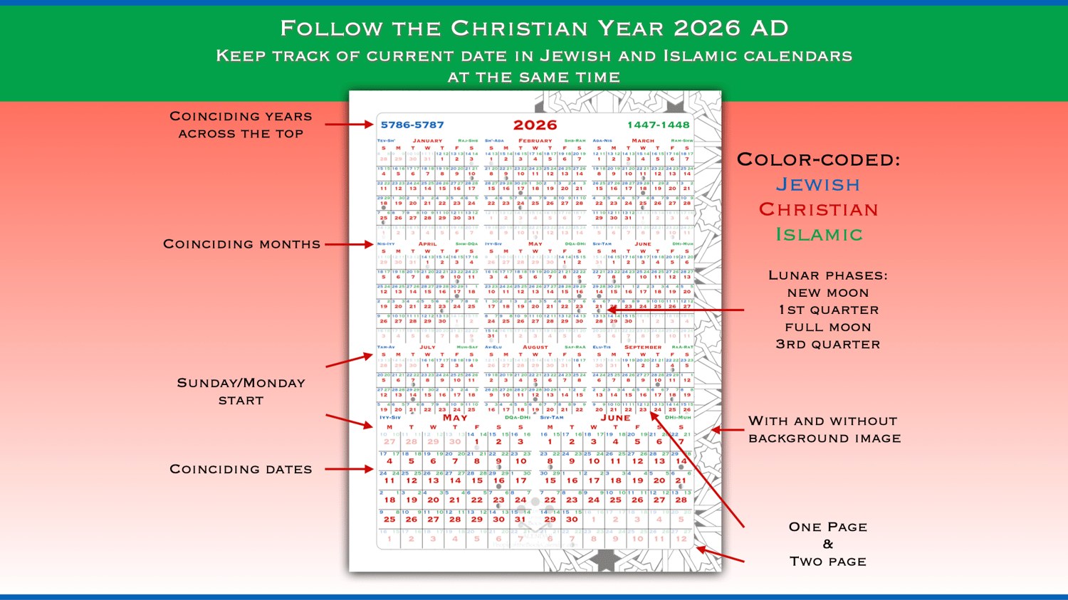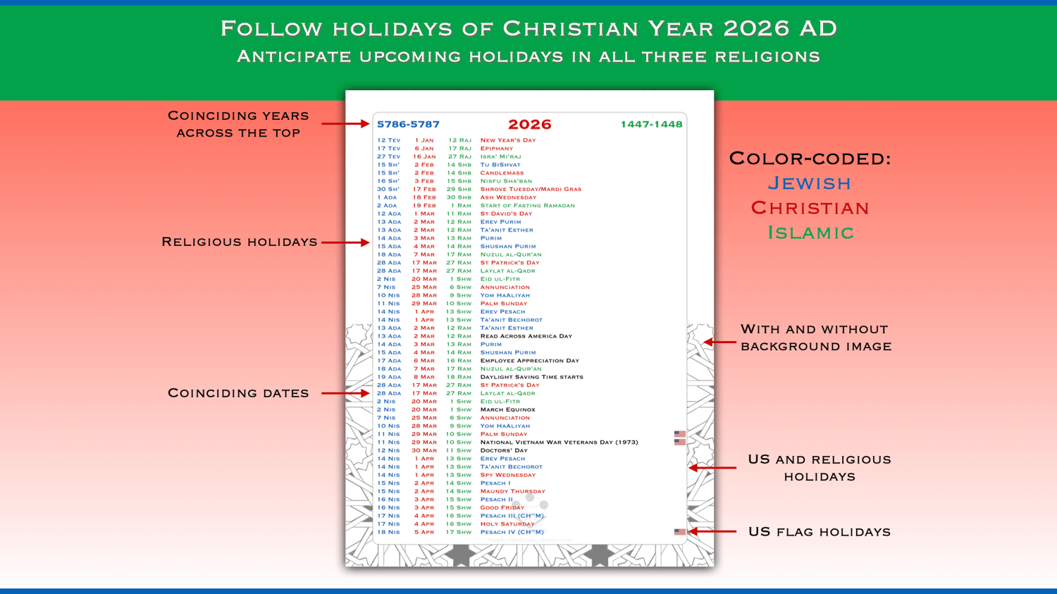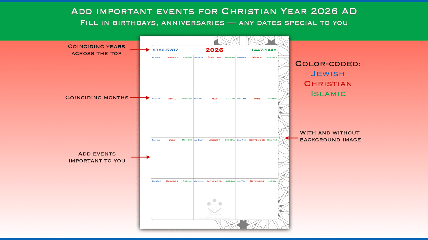 Jewish, Christian and Islamic calendars combined into one. I call it the People of the Book Calendar, referring to the "people of scripture", specifically that of the three Abrahamic monotheistic religions.
