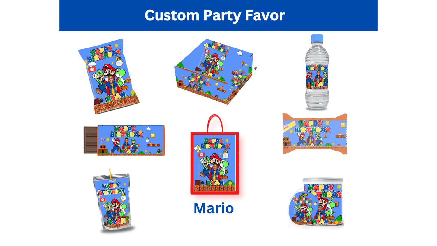 Level up your celebration with our Mario Party Favor Bundle – inspired by everyone’s favorite plumber and his crew! Whether you're planning a gamer-themed birthday or selling custom party sets, this bundle brings bold colors, fun characters, and power-packed treats to the table.