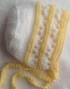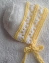Elanore’s Eyelet baby bonnet is worked flat in one piece on two needles. There are 5 sizes to choose from.   The ties can be done many ways, with a ribbon, knitted or crochet. You could knit this all in one colour.