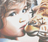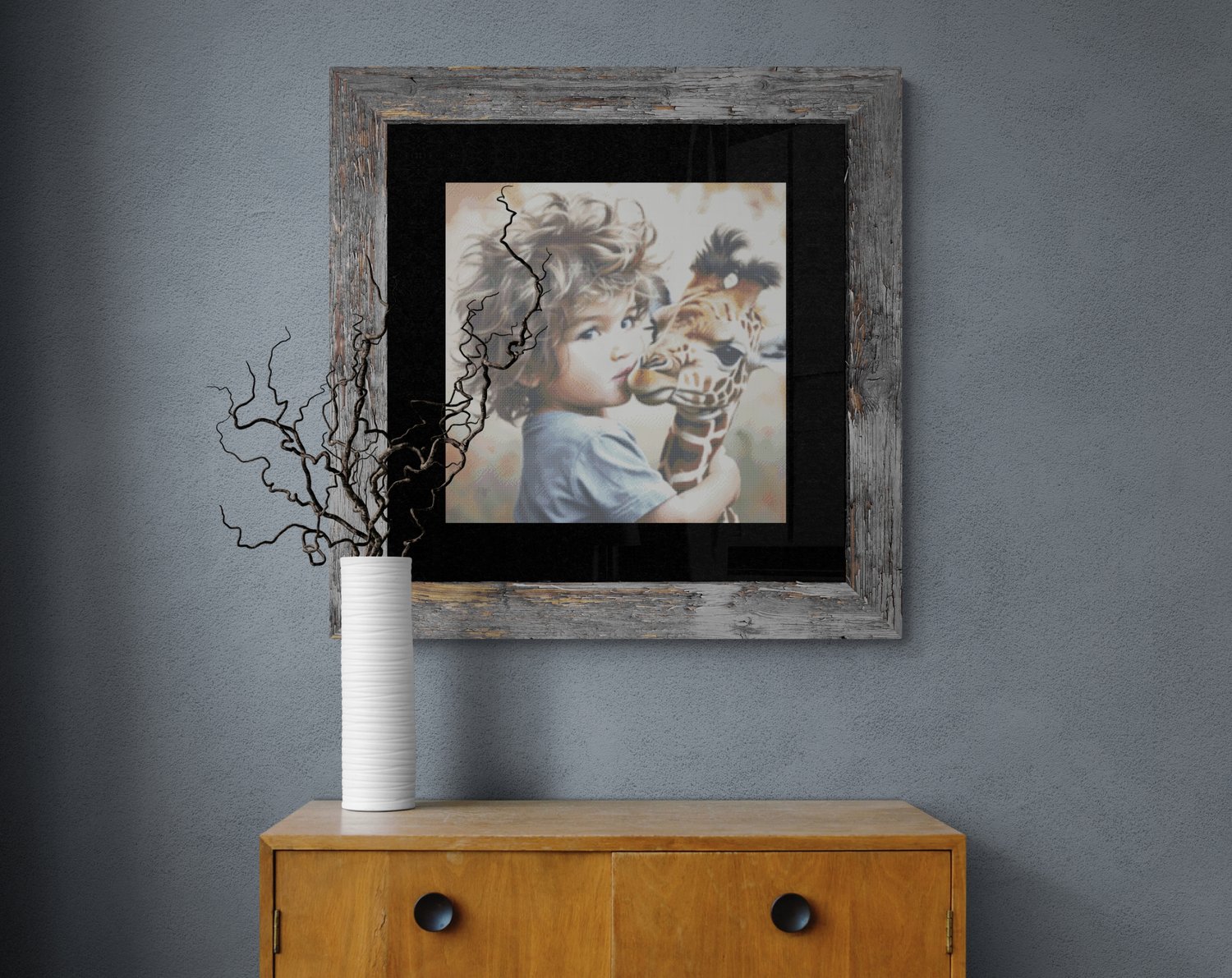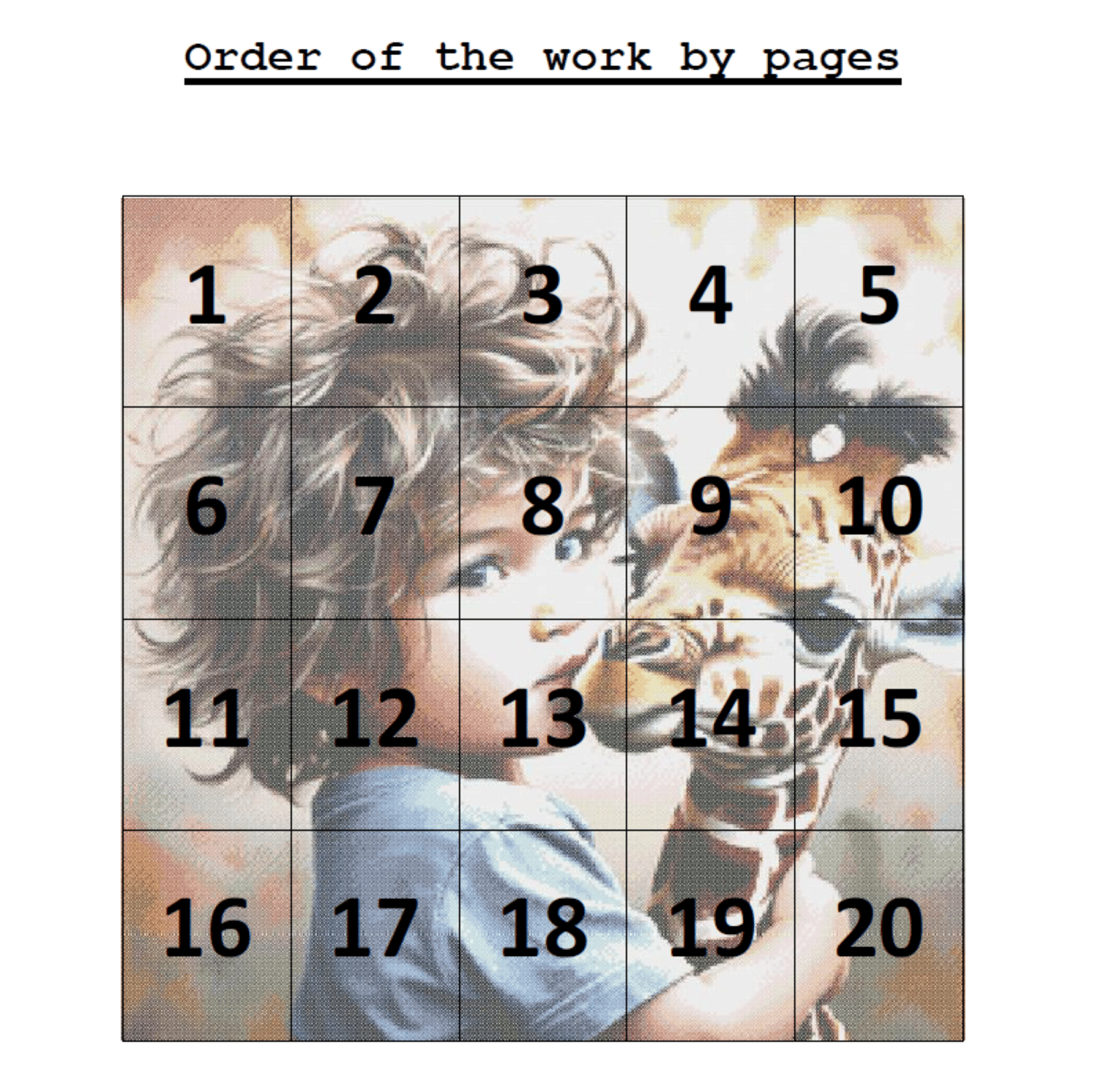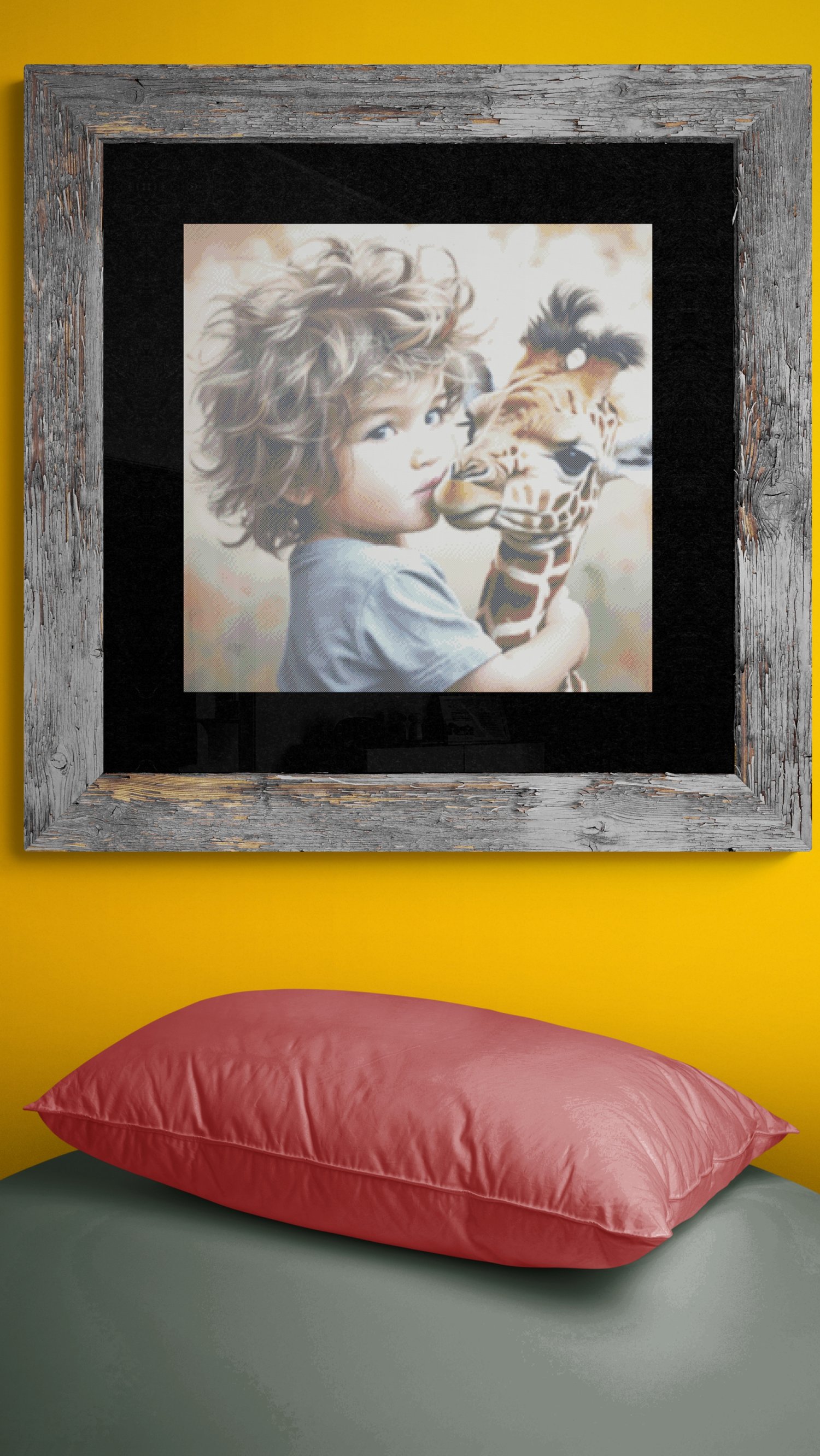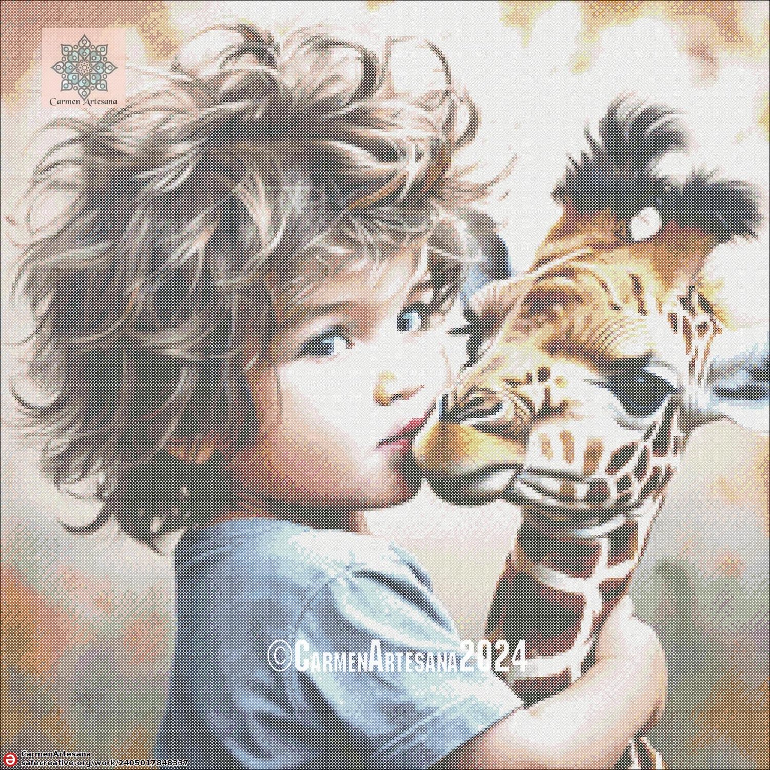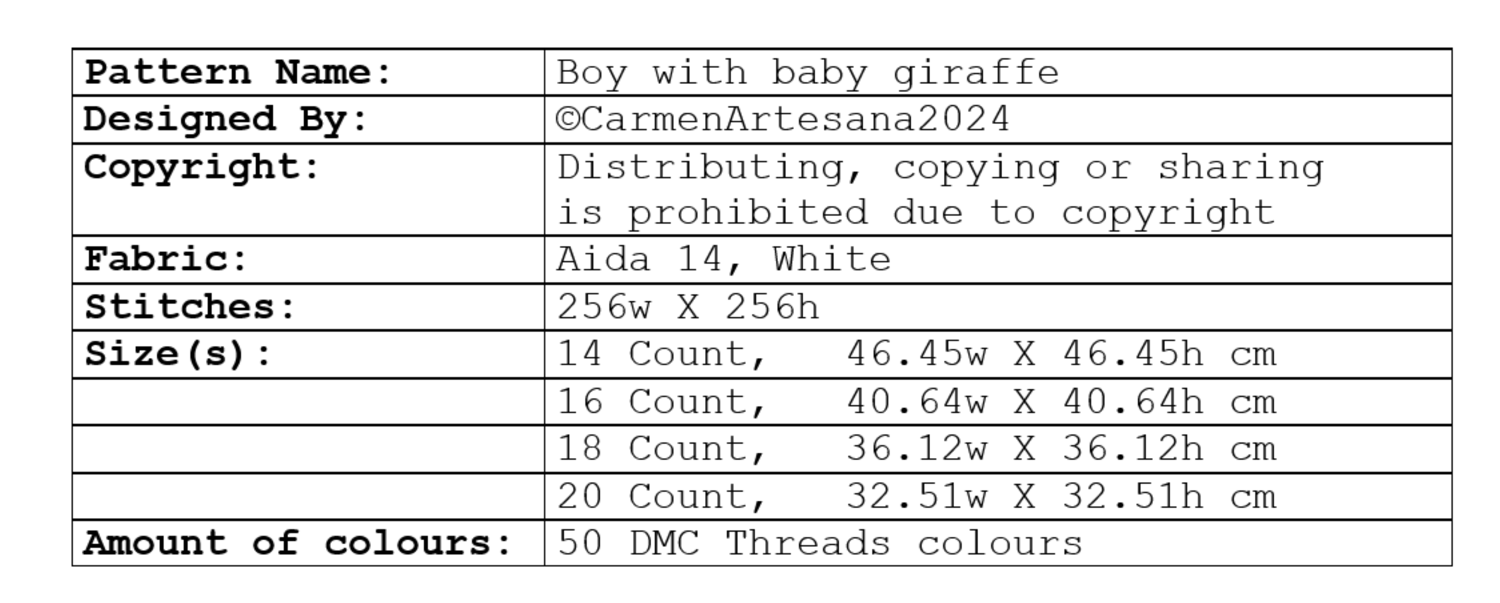 Boy with baby giraffe, PDF cross stitch pattern, English/Español, DMC Threads