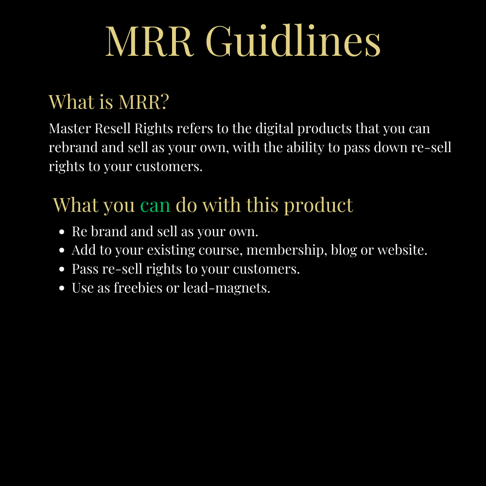 One of the standout features of this ebook is the inclusion of Master Reselling Rights (MRR). This means you have the exclusive right to not only use the ideas but also to resell the ebook as your own. You can keep 100% of the profits, making this a valuable investment for anyone looking to enter the digital product market. The MRR feature allows you to leverage this resource as a product in itself, expanding your business opportunities and income potential.
