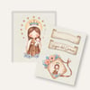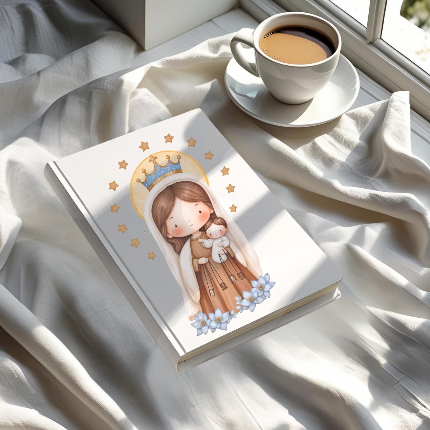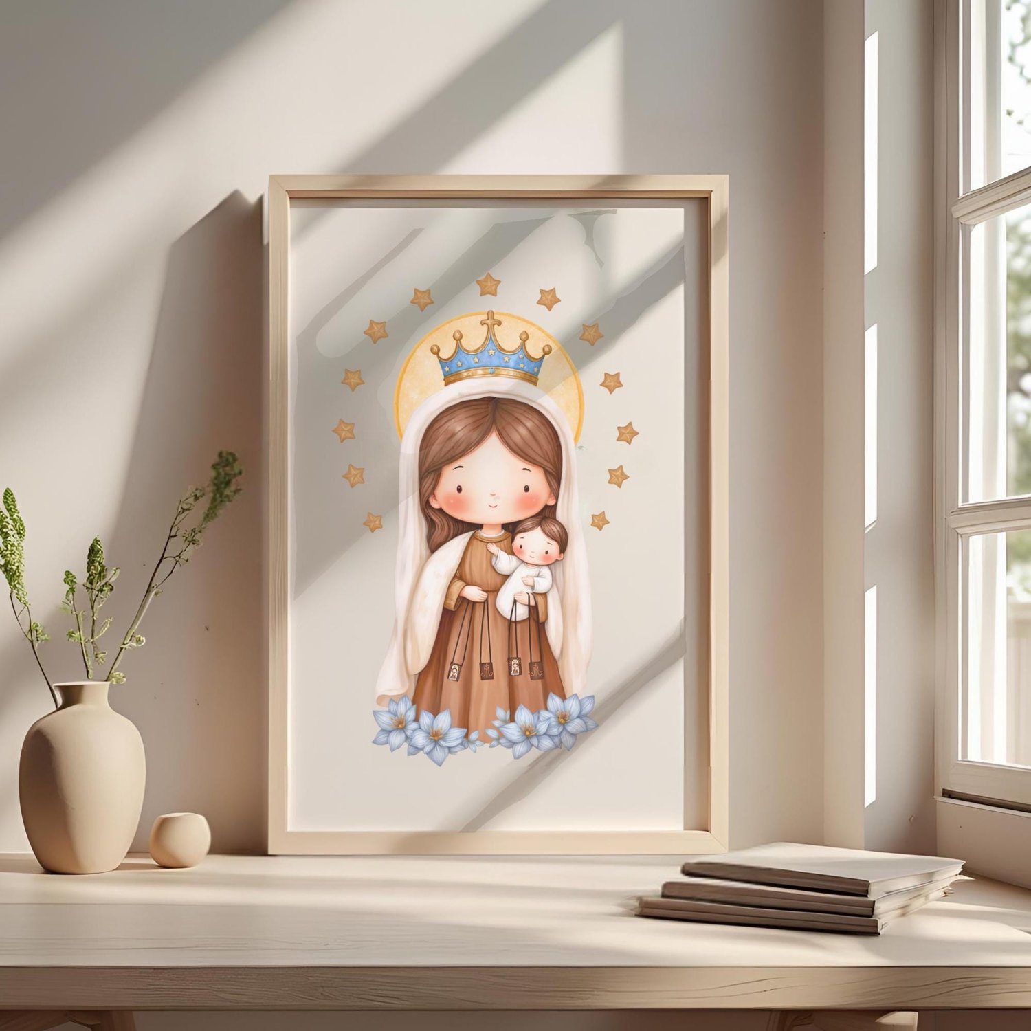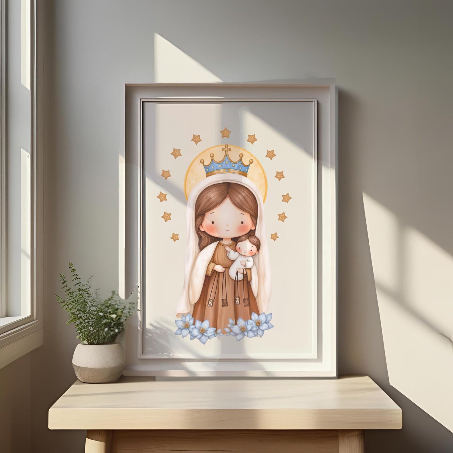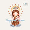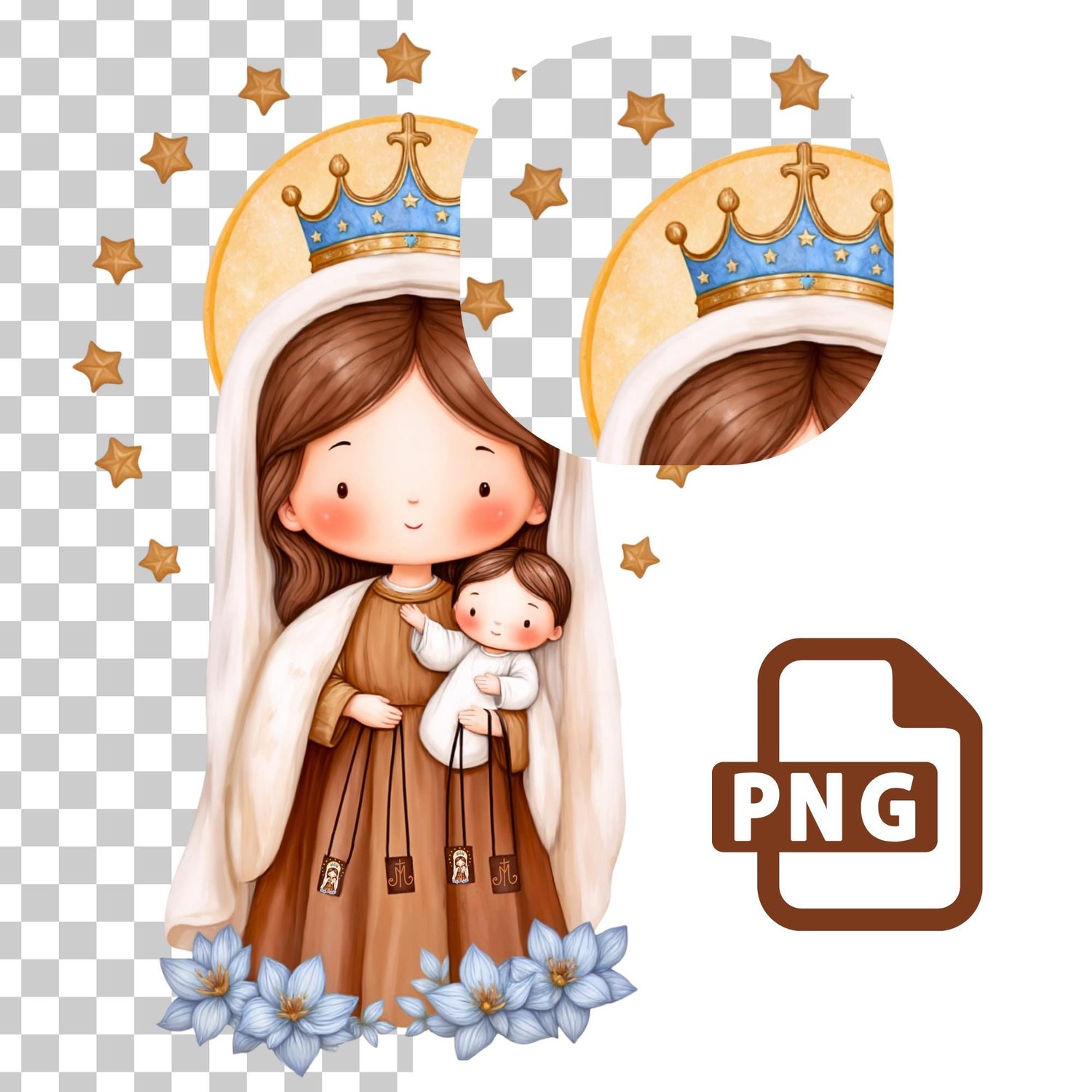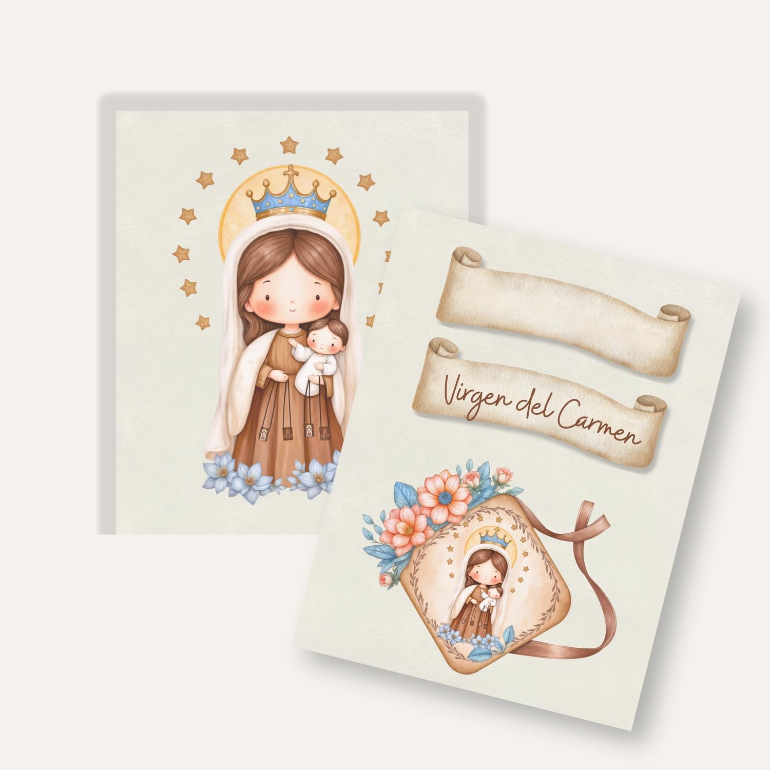 1x Ilustración principal de la Virgen del Carmen: Una imagen de la Virgen María con el Niño Jesús, a menudo sosteniendo el escapulario, en un estilo dulce y moderno. Ideal para estampitas, oraciones, recordatorios, invitaciones y más.